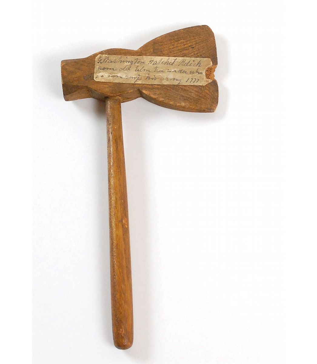 A fine model of an axe evoking the apocryphal tale of Washington chopping down a cherry tree, made from the wood of an elm tree at Washington’s encampment location when he made his famous crossing of the Delaware. The model measures 7.5? long and with the head measuring 3.5? wide, likely carved circa early 1800s. A stained and torn note is affixed to one side of the axe head, in part: “G. Washington Hatchet Relick from old Elm tree under whi[ch] he encamped his army 1777 [sic 1776].” In fine condition, with a chip to the blade area of the axe head.