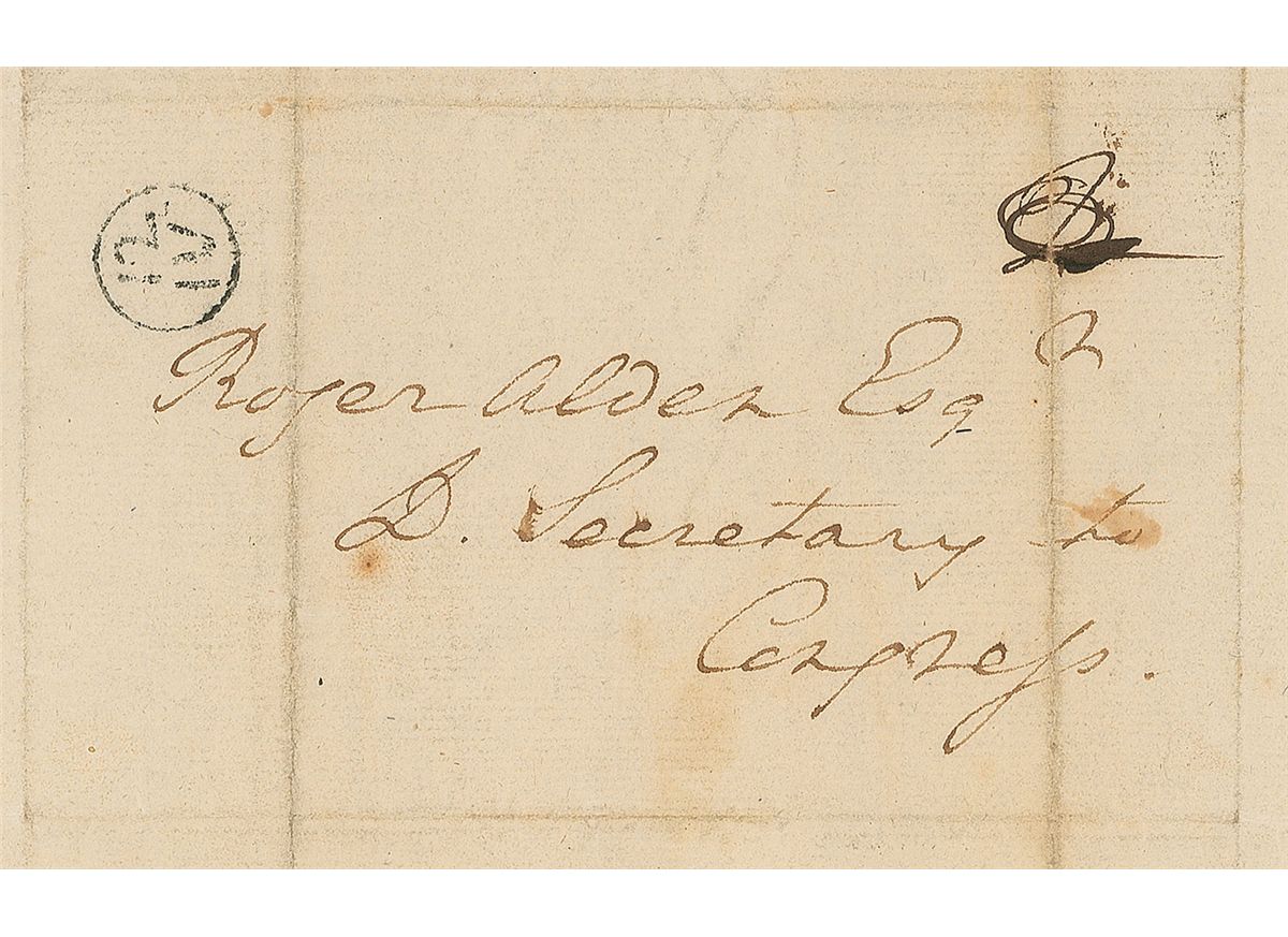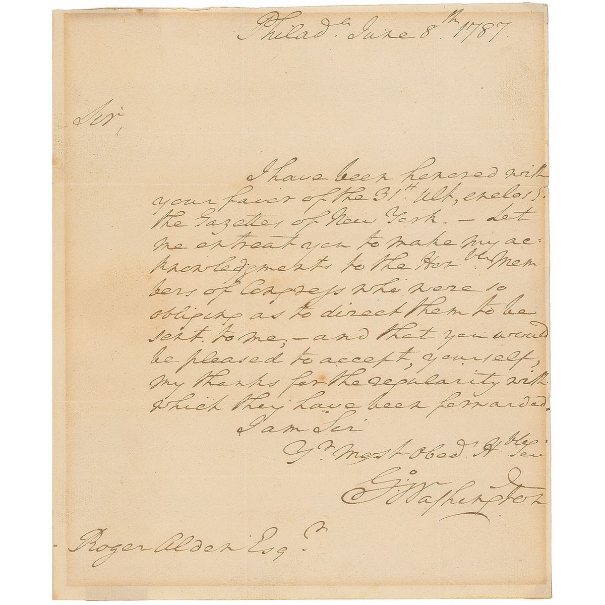 ALS signed “Go: Washington,” one page, 7.25 x 9, Philadelphia, June 8, 1787. Letter to Roger Alden, secretary of Congress. In full: “I have been honoured with your favor of the 31st ult., enclosing The Gazette of New York—Let me entreat you to make my acknowledgements to the Honourable Members of Congress who were obliging as to direct them to be sent to me;—and that you would be pleased to accept, yourself, my thanks for the regularity with which they have been forwarded.” Reverse of second integral page is addressed in Washington’s hand, “Roger Alden, Esqr., D. Secretary to Congress,” with the page also retaining Washington’s black wax seal. In fine condition, with intersecting folds, one through a single letter of signature, a uniform shade of toning from previous display, and some small areas of paper loss and separations to second page. Accompanied by a 1977 certificate of authenticity from Charles Hamilton.