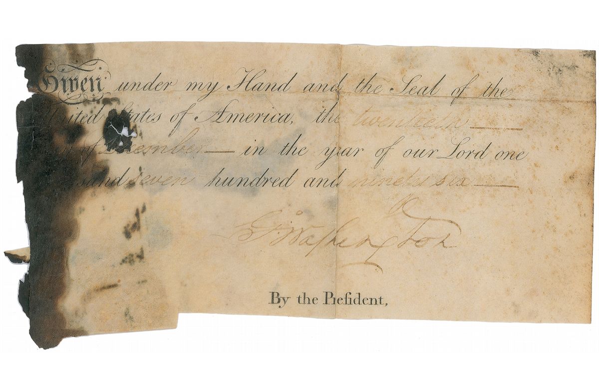 Partly-printed vellum DS as president, signed “G:o Washington,” one page, 7.5 x 3.5, December 20, 1796. Conclusion of a presidential document. In full: “Given under my Hand and the Seal of the United States of America, the twentieth day of December in the year of our Lord one [thou]sand seven hundred and ninety six.” In very good condition, with intersecting folds (one vertical fold passing through a single letter of the signature), scattered foxing, and a charred left side (affecting a few words of the document’s text but not the signature). This document was issued at the end of Washington’s presidency as he was preparing to retire to Mount Vernon, with Vice President John Adams succeeding him as the nation’s leader. It was during this period that he issued his tremendously influential farewell address—first published three months before this document—in which he focused on the importance of national unity, Constitutional law, and isolationism. Despite the damage to the left, the signature area is crisp and clean, presenting a fine example of Washington’s presidential autograph.