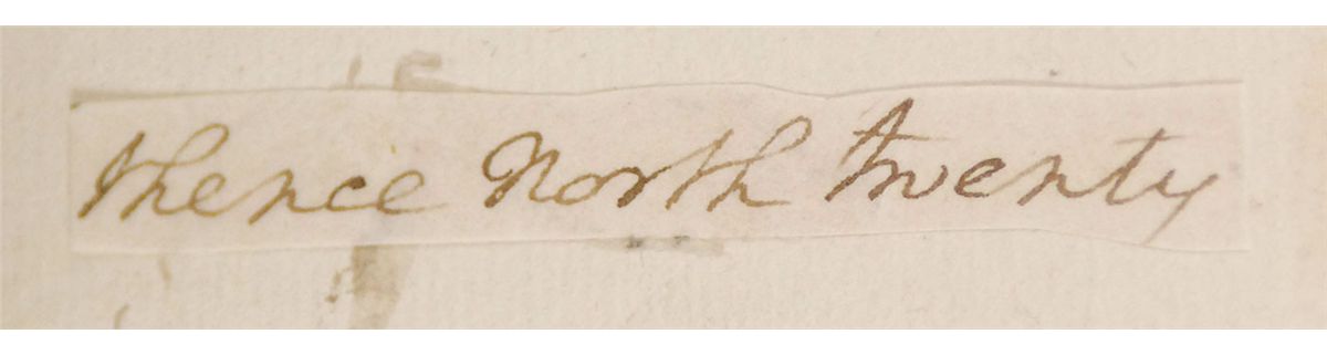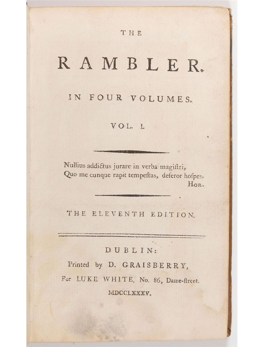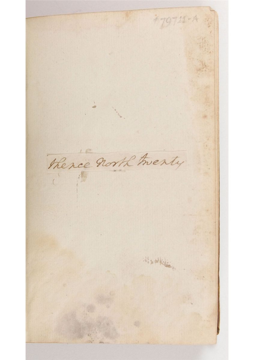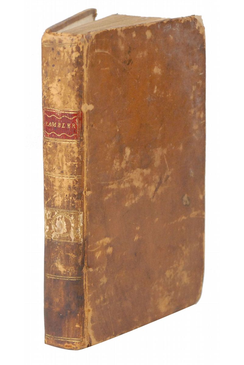 Rare book from the library of George Washington: The Rambler, Volume 1, by Samuel Johnson. 11th edition. Dublin: printed by D. Graisberry, 1785. Bound in full leather, burgundy label with gilt on spine, 4.25 x 6.75, 322 pages. A slip affixed to the first free end page bears three words written in Washington’s hand, “thence North twenty,” and the ornately bordered bookplate of Benjamin Lincoln Lear is affixed to the front pastedown. In very good condition, with dampstains to endpapers and some blank margins, normal exterior wear, and lightly soiled interior. This book was originally part of an auction that included items from the Tobias Lear family. Lear was Washington’s closest confidant and personal secretary, serving Washington from 1784–1799. Accompanied by color photocopies of the first page of a list titled “Catalogue of Books received from Washington,” listing “Rambler” among them. A terrific combination of Washington’s handwriting with a book he personally owned.