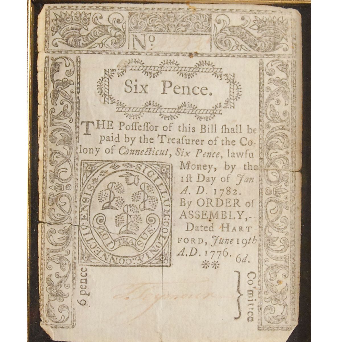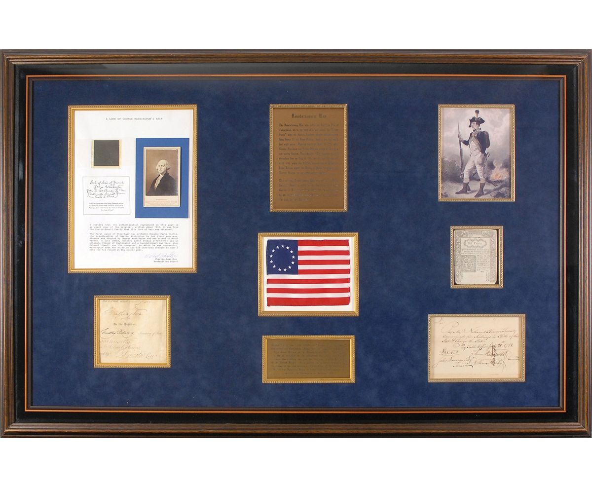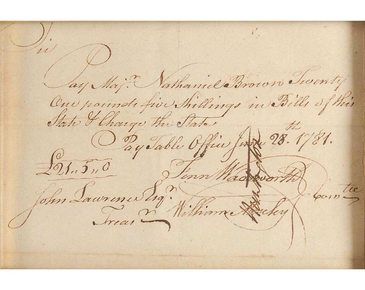Exquisite ink signature as president, “Go: Washington,” on an off-white 4.5 x 4.5 vellum slip clipped from a document, also signed by Secretary of State Timothy Pickering and dated 1796. Also includes five strands of Washington’s hair in a clear envelope affixed to a certificate of authenticity from Charles Hamilton. In fine condition, with a vertical fold passing through a single letter of Washington’s signature. Additional accompaniments are a 1776 Connecticut six-pence banknote, and a manuscript pay order document for Nathaniel Brown, a soldier in the Connecticut line of the Continental Army, dated 1781.