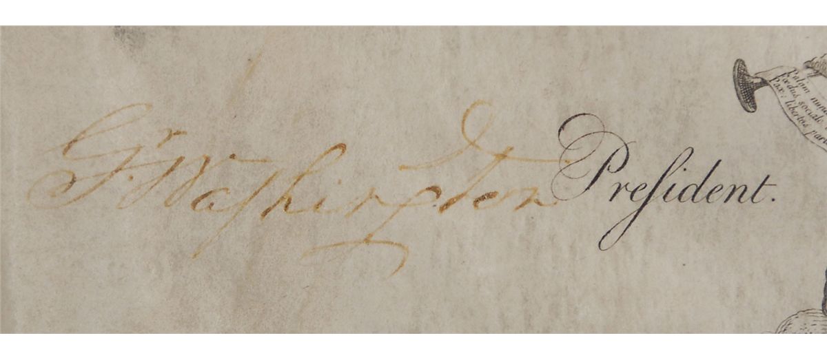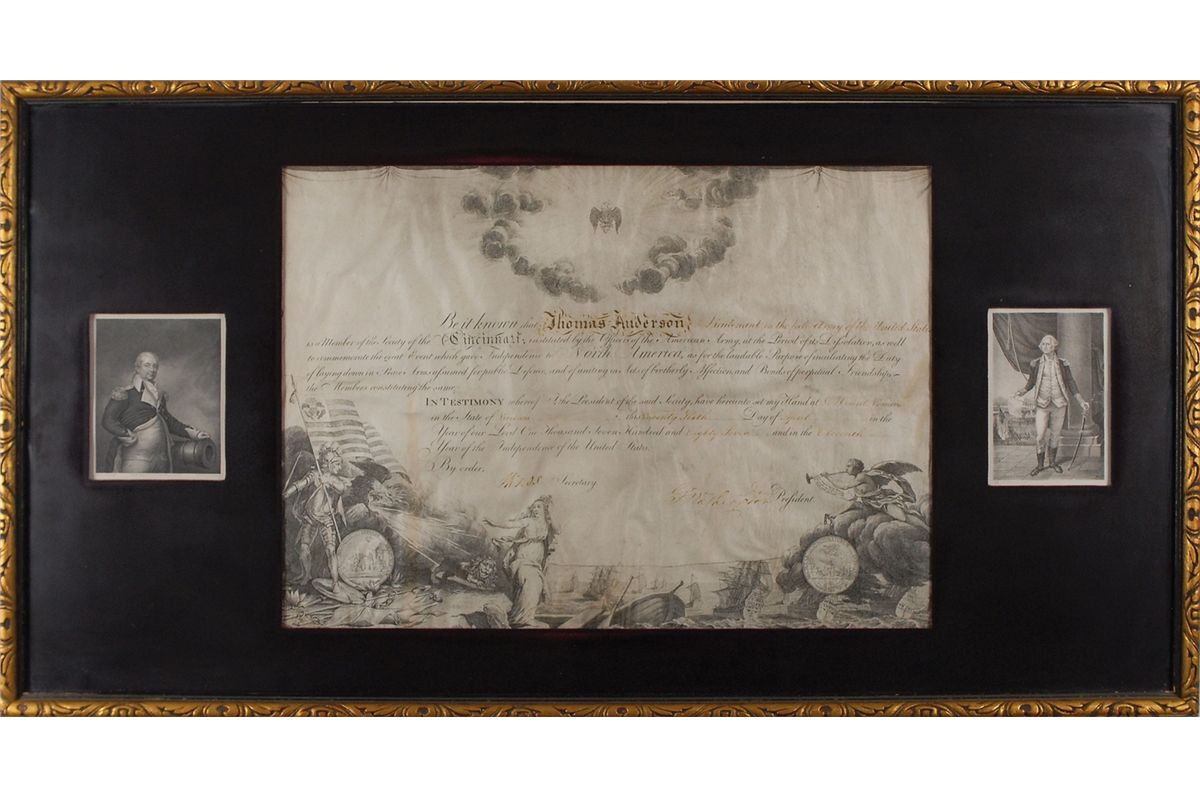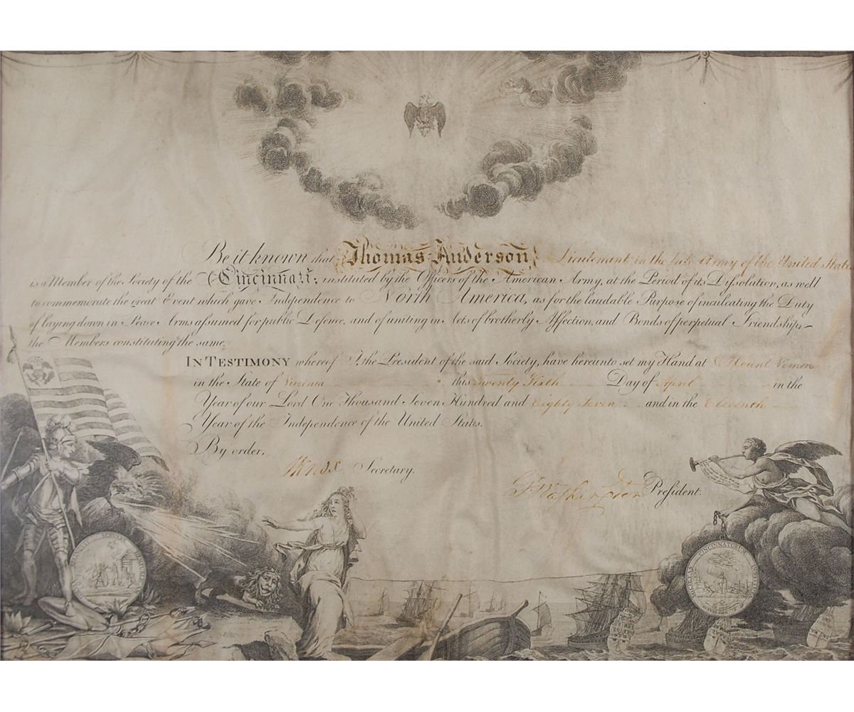 Partly-printed vellum DS, signed “G: Washington,” one page, 18.5 x 13, April 26, 1787. A Society of Cincinnati membership certificate issued to Thomas Anderson. In part: “Be it known that Thomas Anderson, Lieutenant in the late Army of the United States, is a Member of the Society of the Cincinnati; instituted by the Officers of the American Army, at the Period of its Dissolution, as well to commemorate the great Event which gave Independence to North America, as for the laudable Purpose of inculcating the Duty of lying down in Peace Arms assumed for public Defence, and of uniting in Acts of brotherly Affection, and Bonds of perpetual Friendship…In Testimony whereof I, the President of the said Society, have hereunto set my Hand at Mount Vernon.” Signed at the conclusion by Washington as the Society’s president and countersigned by Henry Knox as secretary. Suede-matted and framed with two portraits to an overall size of 34 x 18. Significant overall rippling and engrossed text and signatures a few shades light, otherwise very good condition; a more well-preserved example than typically found.