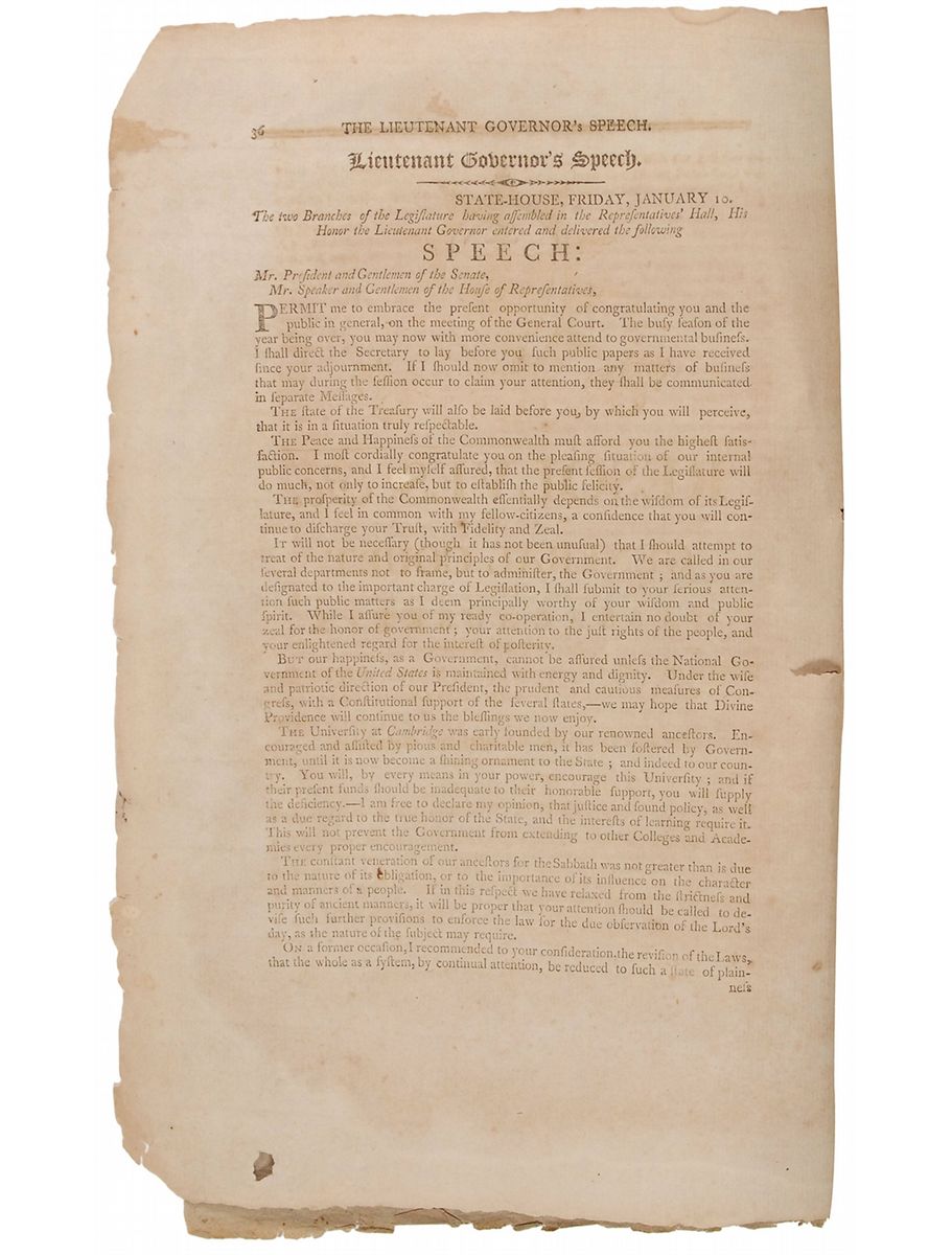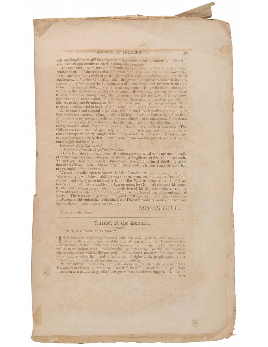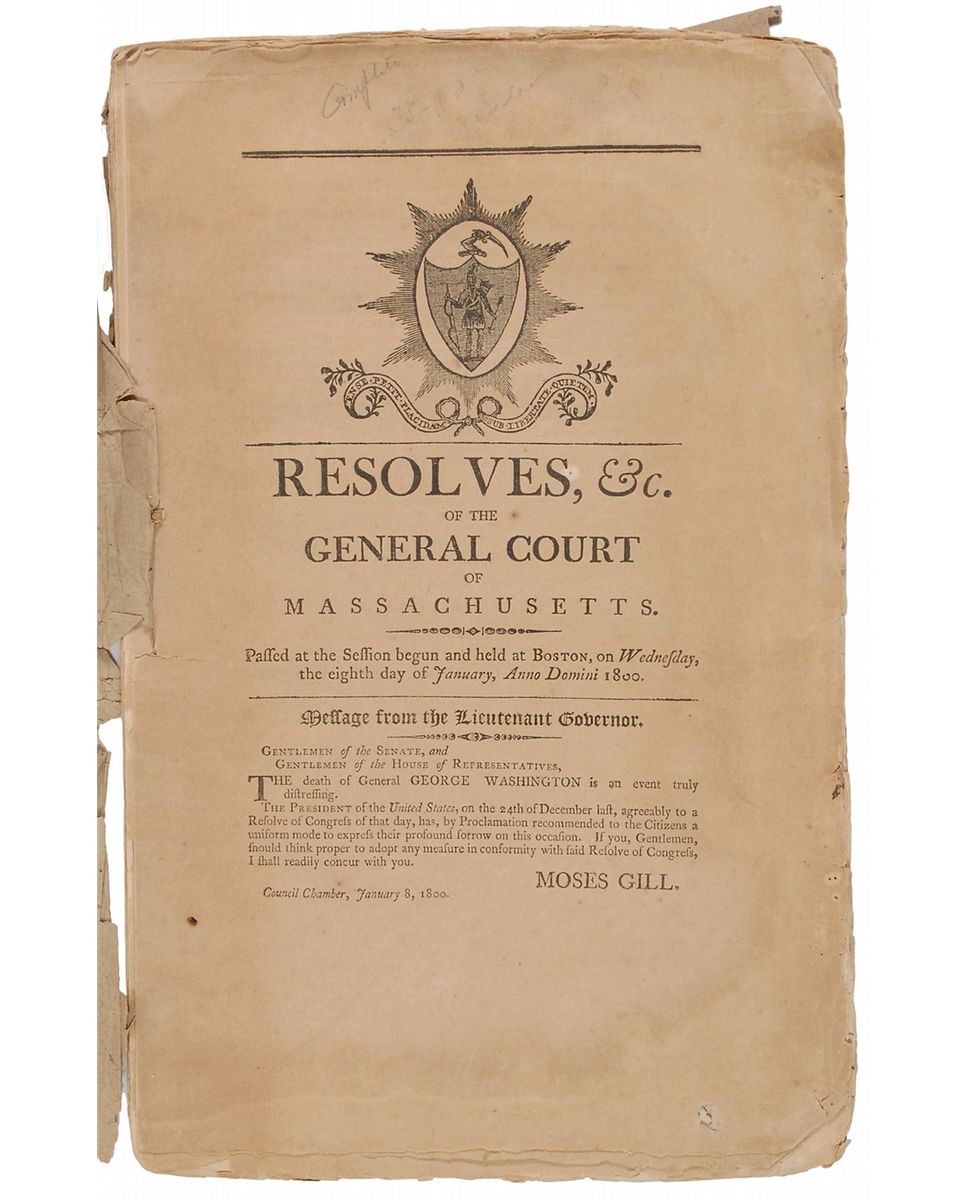 Unsigned printed booklet entitled “Resolves, &c. of the General Court of Massachusetts. Passed at the Session begun and held at Boston, on Wednesday, the eighth day of January, Anno Domini 1800,” 52 pages, 8.75 x 13.75, covering January 1 to March 5, 1800. Printed by Young and Minns, Printers to the State. Boston: March 1800. The title page features a message from Lieutenant Governor Moses Gill, in part: “The death of General George Washington is an event truly distressing. The President of the United States, on the 24th of December last, agreeably to a Resolve of Congress of that day, has, by Proclamation recommended to the Citizens a uniform mode to express their profound sorrow on this occasion.” The second and third pages contain a speech by Gill, including topics such as education, agriculture, and Sabbath laws, as well as honoring the late President Washington. Referring to the "unfeigned sorrow universally exhibited" after the recent death of Governor Increase Sumner, Gill laments "the loss of another Patriot, General George Washington, whose invaluable life was the ornament, example and defence of our Nation." The remaining resolutions concern various local issues, and there are also resolves for erecting monuments for General Washington and the Battle of Lexington. Bound in paper wraps, with front cover separated. In very good condition, with overall toning to fragile pages and chipping to edges.