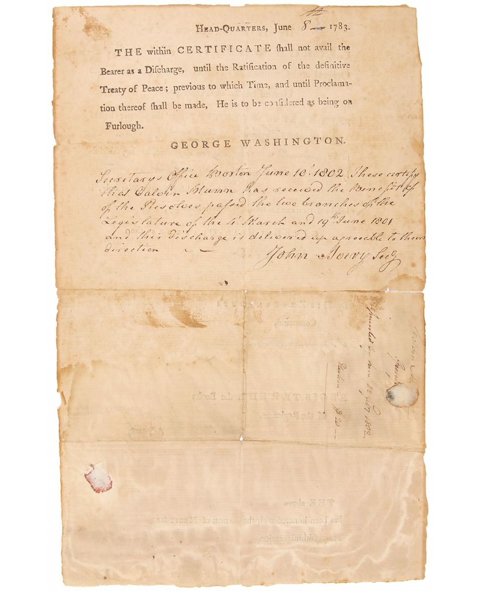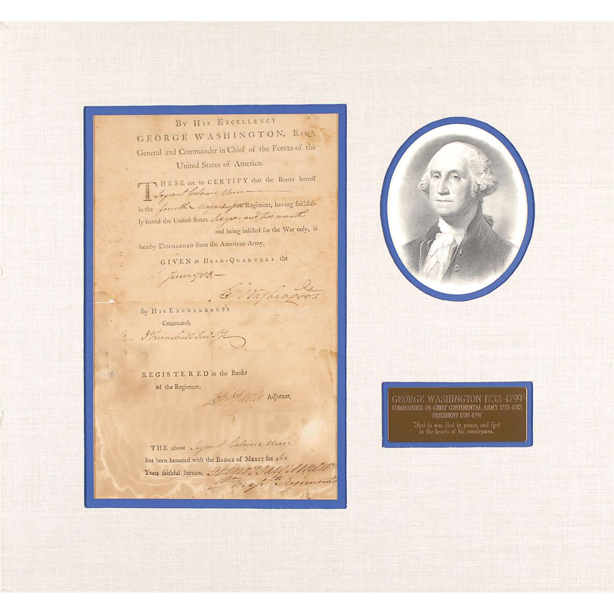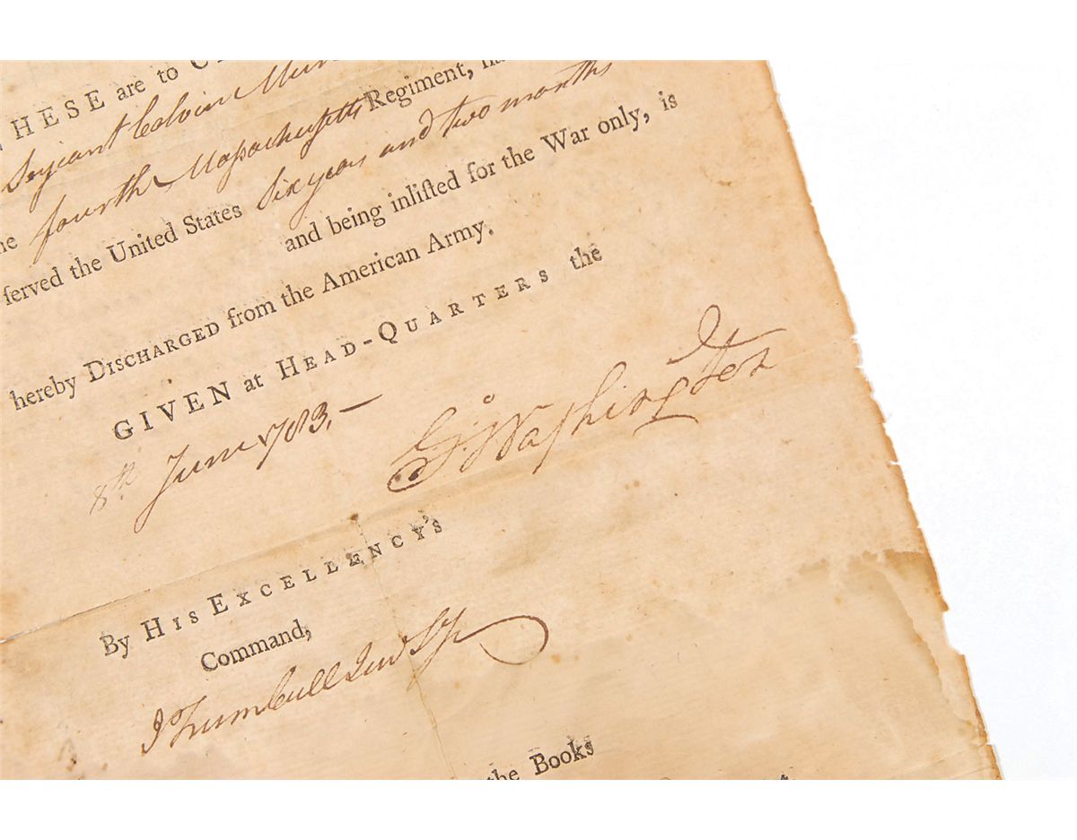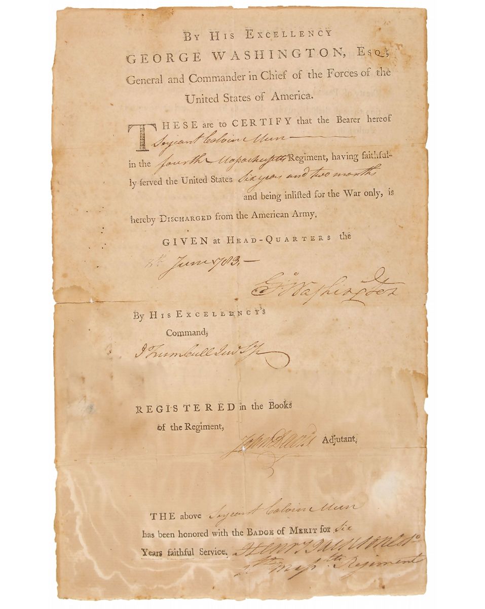 Partly-printed DS, signed “G:o Washington,” one page, 7.75 x 12.25, June 8, 1783. Rare military document, in full: “By His Excellency George Washington, Esq; General and Commander in Chief of the Forces of the United States of America. These are to certify that the Bearer hereof Serjeant Calvin Mun in the fourth Massachusetts Regiment, having faithfully served the United States Six years and two months and being inlisted for the War only, is hereby Discharged from the American Army.” In very good condition, with intersecting folds with some partial tape-repaired separations, and moderate to heavy scattered staining, toning, and soiling; Washington’s signature remains extremely crisp and bold, as does all other writing. Accompanied by an attractive cloth mat with an engraved portrait and nameplate for display.