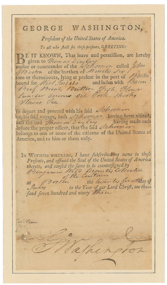 Uncommon partial partly-printed DS as president, signed “G:o Washington,” one page, 4 x 7.75, July 24, 1793. English panel removed from a multi-language ship’s pass, issued to “Thomas Dingley master or commander of the Schooner called John of Boston…lying at present in the port of Boston bound for West Indies and laden with Bacon, Beef, Bread, Butter, Fish, Flour, Lumber, Onions, Oil, Pork, Shooks, Staves, Tea.” Prominently signed at the conclusion by President Washington. Professionally inlaid into a slightly larger sheet. Restored to very good condition, with repaired separations to horizontal folds (one passing through the upper portion of the signature), and irregular overall toning. A ‘Thomas Dingley’ was appointed a Massachusetts militia captain in 1776, but it is unclear if this is a coincidence or if he went on to become a ship captain. Nevertheless, an interesting and highly desirable format from America’s first president.