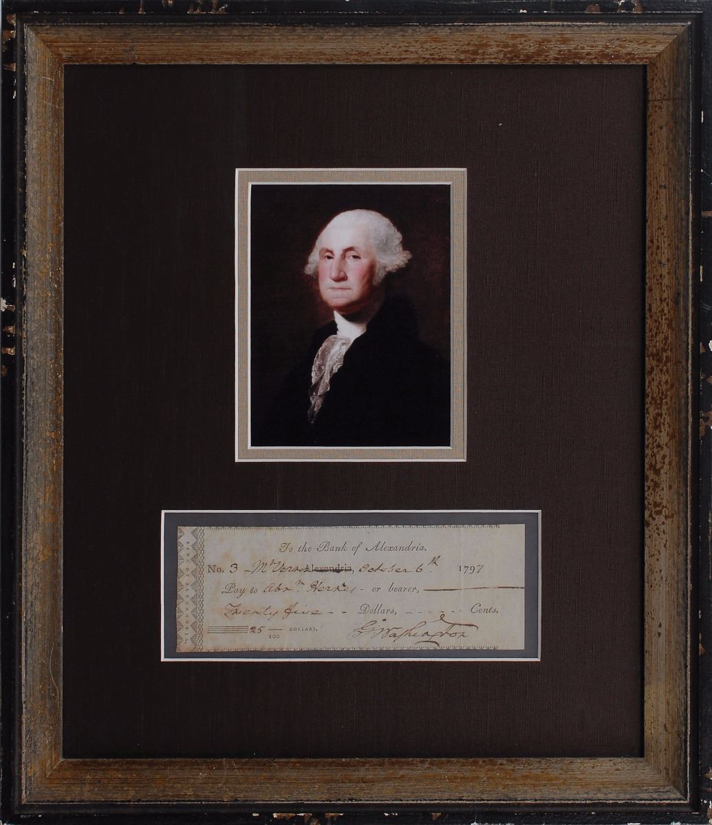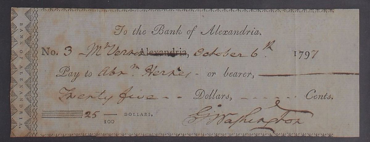Rare Bank of Alexandria check, 6.75 x 2.25, filled out and signed by Washington, “G:o Washington,” payable to Abraham Herner for $25, October 6, 1797. Washington also amended the printed location to read “Mt. Vernon,” rather than Alexandria. Double-matted and framed with an engraved portrait. In fine condition. Washington was a depositor and stockholder in the Bank of Alexandria, which was the first bank in Virginia when it was established in 1792. In his will, he directed that his account and holdings in the institution be used to endow a free school for orphaned and indigent children. Washington checks in such exceptional condition are virtually unobtainable, this being perhaps the only uncut example extant.