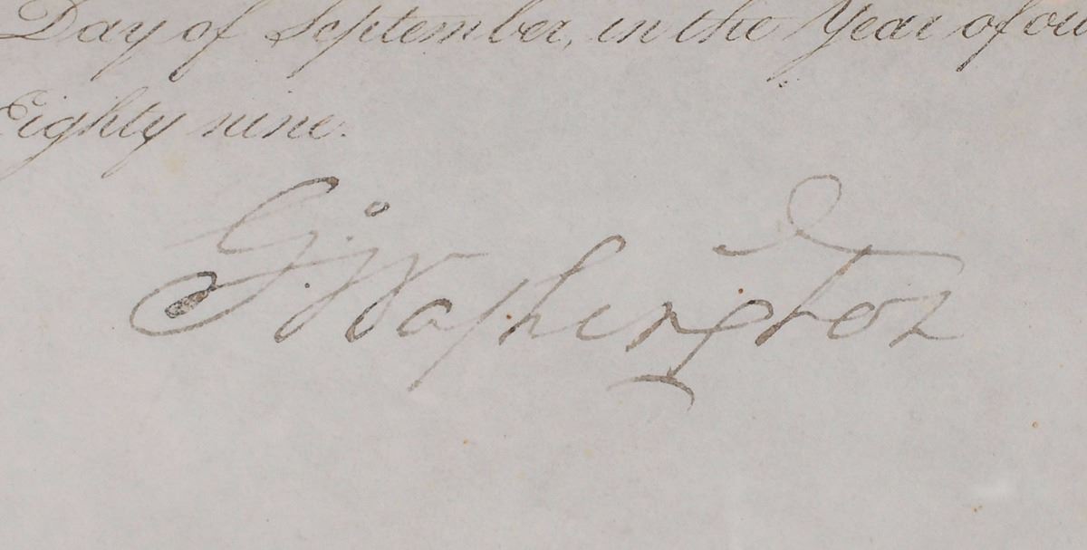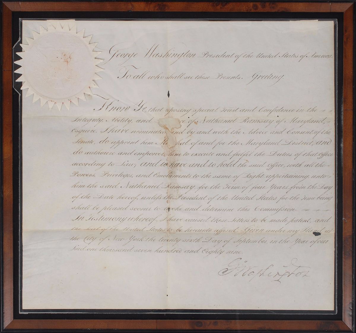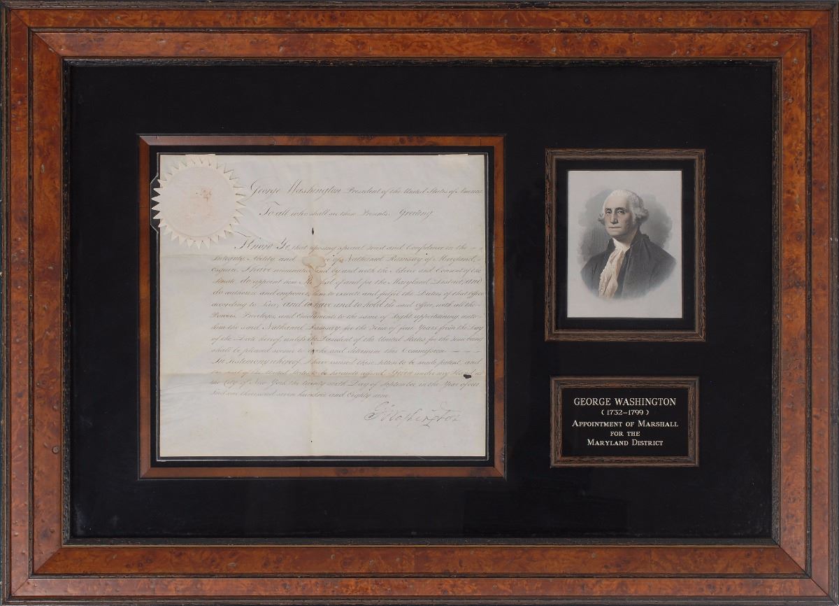 Manuscript DS as president, signed “G:o Washington,” one page, 10.75 x 9.75, September 26, 1789. President Washington appoints Nathaniel Ramsey of Maryland as “M[ar]shal of and for the Maryland District…for the Term of four years.” Beautifully signed at the conclusion by President Washington. The crisply embossed white paper seal affixed to the upper left remains fully intact. Removably encapsulated in a mylar sleeve and double-matted and framed with an engraved portrait and nameplate. Small areas of paper loss along intersecting folds (affecting a few words in the center) and some mild show-through at the top edge from mounting remnants to reverse, otherwise fine condition; Washington’s crisp signature against the bright, clean document is a choice exemplar.