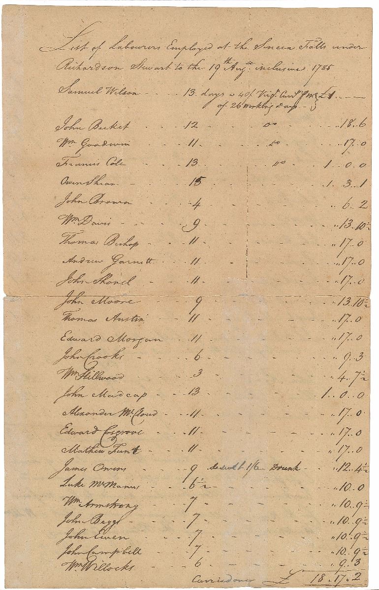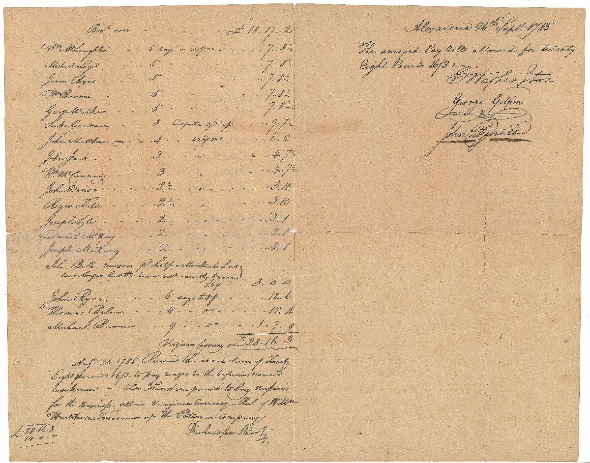 Manuscript DS, signed “G:o Washington,” three pages on two adjoining sheets, 8 x 13, September 26, 1785. Payroll document headed, “List of Labourors Employed at the Seneca Falls under Richardson Stewart to the 19th Augst. inclusive 1785.” The document lists over forty people with their salaries, amounting to a total of £28.16.3. Signed on the adjoining page by George Washington, George Gilpin, and John Fitzgerald to approve the payment. In very good condition, with archival tape repairs to complete separations along folds. This is the first known payroll of the The Potowmack Company, according to the University of Virginia.