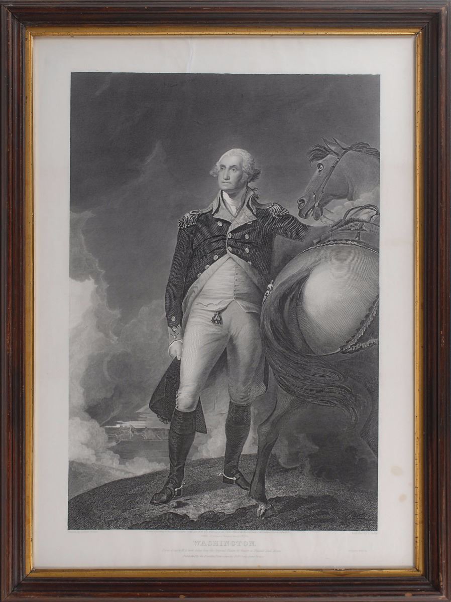 Impressive engraved portrait of George Washington by T. Kelly after the famous painting by Gilbert Stuart, 19.5 x 27.5, published by the Franklin Print Company of Boston and printed by W. V. Coles. A copyright date of 1836 appears below the image and a caption below reads, “From a copy by M. A. Swett taken from the Original Picture by Stuart in Faneuil Hall Boston.” Framed and in fine condition, with a professionally repaired tear to blank upper border.