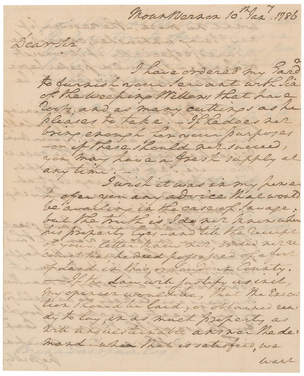 Amazing and extraordinarily well-preserved ALS signed “G. Washington,” three pages on two sheets, 7.25 x 9, Mount Vernon, January 10, 1786. Letter to Bryan Fairfax, Washington’s boyhood friend and nephew of Thomas Lord Fairfax. In full: “I have ordered my Gardr to furnish your Servant with Six of the weeping Willows that have roots; and as many cuttings as he pleases to take. If he does not bring enough for your purposes—or if these should not succeed, you may have a fresh supply at any time.