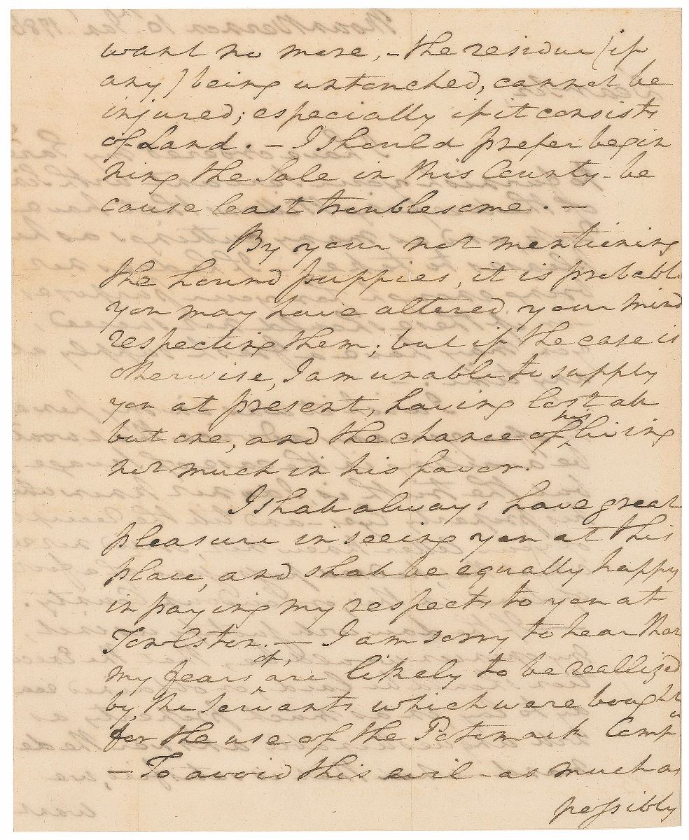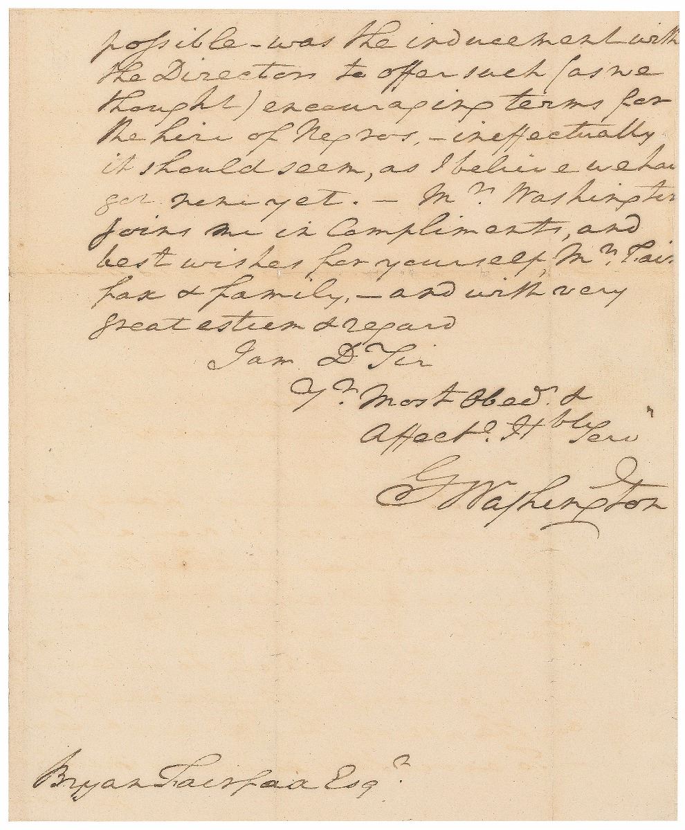 I shall always have great pleasure in seeing you at this place, and shall be equally happy in paying my respects to you at Towlston. I am sorry to hear that my fears, are likely to be reallized by, the Servants which were bought for the use of Potomack Comp'y. To avoid this evil—as much as possible—was the inducement with the Directors to offer such (as we thought) encouraging terms for the hire of Negros, ineffectually it should seem, as I believe we have got none yet. Mrs Washington joins me in Compliments, and best wishes for yourself, Mrs Fairfax & family.” Professionally inlaid into slightly larger off-white adjoining sheets. In fine to very fine condition, with intersecting folds and show-through from writing to opposing sides; it is truly impeccable, beautifully penned in bold ink and remaining as clean as the day it was written.