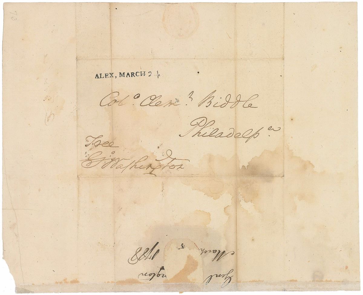 Full hand-addressed free frank, 9.25 x 7.5, with franked panel measuring 5.25 x 3.5. Addressed in Washington’s hand to “Col. Clem. Biddle, Philadelp,” and franked in the lower left, “Free Go: Washington.” Stamped above, “Alex[andria], March 24,” and docketed in another hand with the date 1788. In very good to fine condition, with light staining and a repaired area of seal-related paper loss; the writing remains clear and dark.