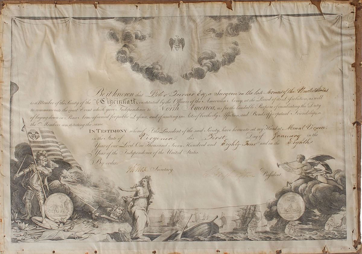 Partly-printed vellum DS, signed “Go: Washington,” one page, 21 x 15, January 1, 1784. A Society of Cincinnati membership certificate issued to Peter Turner. In part: “Be it known that Peter Turner Esq; a Surgeon in the late Armies of the United States is a Member of the Society of the Cincinnati; instituted by the Officers of the American Army, at the Period of its Dissolution, as well to commemorate the great Event which gave Independence to North America, as for the laudable Purpose of inculcating the Duty of lying down in Peace Arms assumed for public Defence, and of uniting in Acts of brotherly Affection, and Bonds of perpetual Friendship…In Testimony whereof I, the President of the said Society, have hereunto set my Hand at Mount Vernon.” Signed at the conclusion by Washington as the Society’s president and countersigned by Henry Knox as secretary. Nail to a board at edges and in very good condition, with some edge tears, moderately heavy overall wrinkling, and the signature quite light but entirely readable.