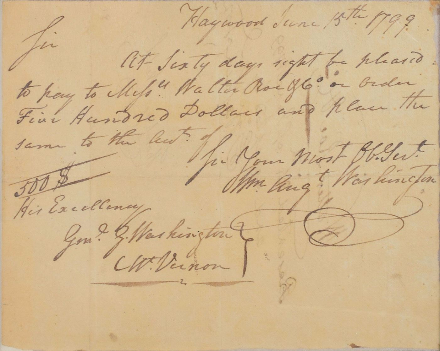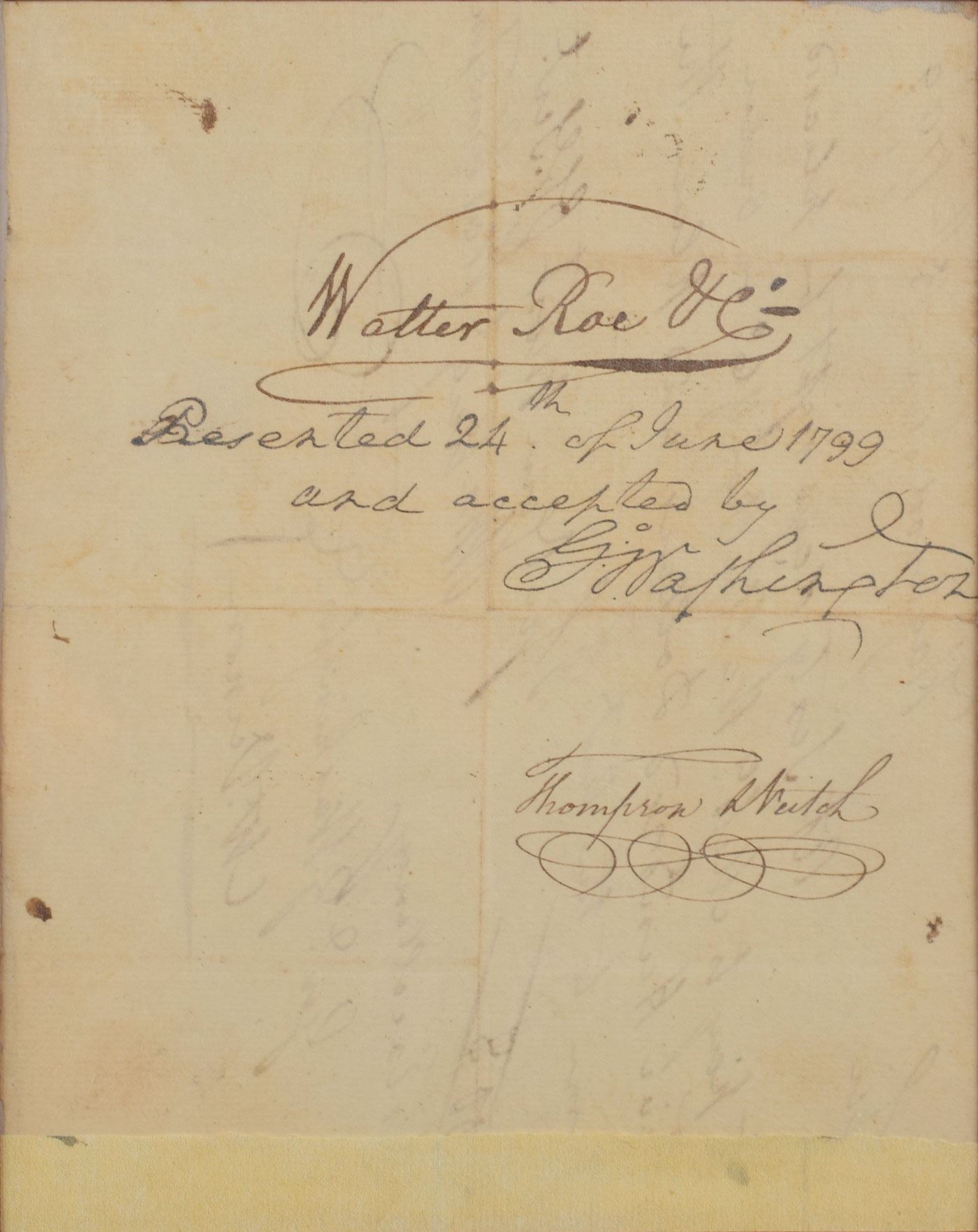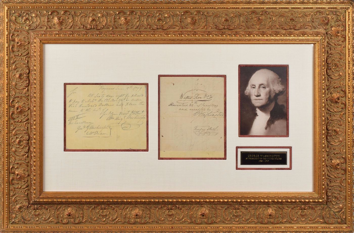 Autograph endorsement signed, "Presented 24th of June 1799 and accepted by G:o Washington,” on the reverse of a manuscript document, one page, 5.75 x 7.25, June 15, 1799. Washington authorizes a $500 payment for corn, perhaps to be used at the Mount Vernon distillery. The front bears a pay draft by his cousin William Augustine Washington, in full: "At sixty days sight be pleased to pay to Messrs. Walter Roe & Co. on order of Five Hundred Dollars and place the same to the Acct of Your Most Ob. Servt Wm. Augt. Washington." Also annotated on the reverse in other hands, "Walter Roe & Co." and "Thompson & Veitch." Elegantly double-matted and framed with a portrait, plaque, and reproduction of the opposite side to an overall size of 33 x 21.5. In fine condition, with an old mounting strip along the lower edge, and signs of silking to the edges. Washington credited William Augustine on May 11, 1799, for the delivery of 187.5 barrels of 'Indian Corn' valued at $500, in his Mount Vernon ledger. William Augustine's $500 draft was forwarded to George Washington by Alexandria merchant William Wilson, and payment was later called for by Thompson & Veitch. The most common beverage produced at Washington’s Mount Vernon distillery was a whiskey made from 60% rye, 35% corn, and 5% malted barley; it reached peak production in 1799, producing 11,000 gallons of whiskey. A highly desirable, neatly endorsed document from the last summer of Washington's life.