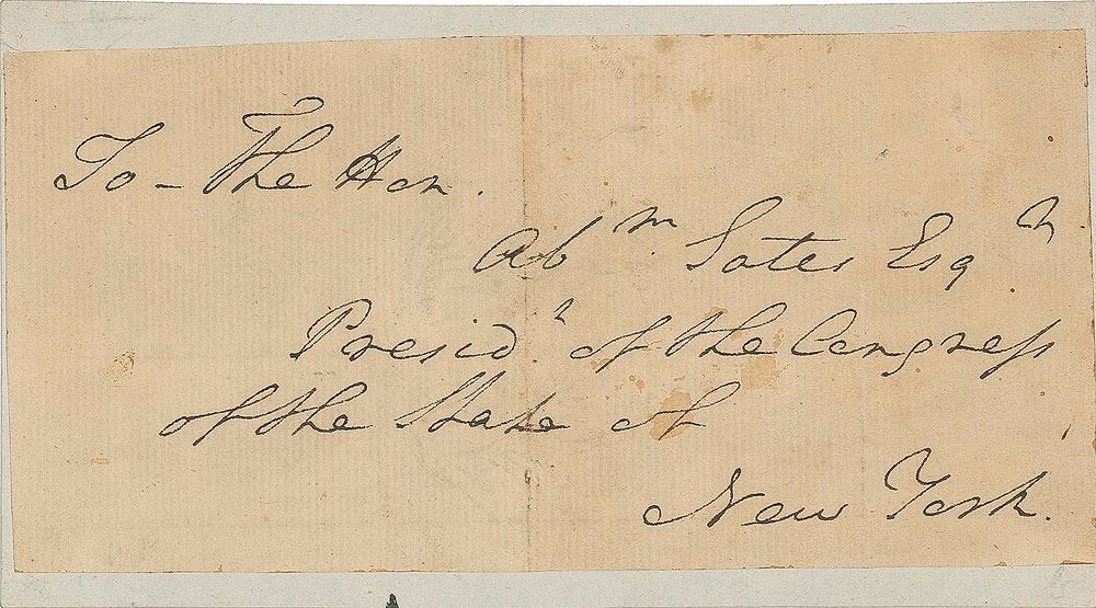 Extremely desirable address panel accomplished entirely in Washington's hand, 6.25 x 3, no date but circa 1776, in full: "To the Hon. Ab'm Yates Esq'r, Presid't of the Congress of the State of New York." Affixed to a slightly larger sheet which bears a notation on the reverse by autograph dealer Walter R. Benjamin certifying the authenticity of the piece. In very good to fine condition, with light soiling and staining. Accompanied by an unsigned engraved portrait. Abraham Yates became president of the New York Congress on August 28, 1776, and served in that role for only a month, presumably dating this piece to that historic year.