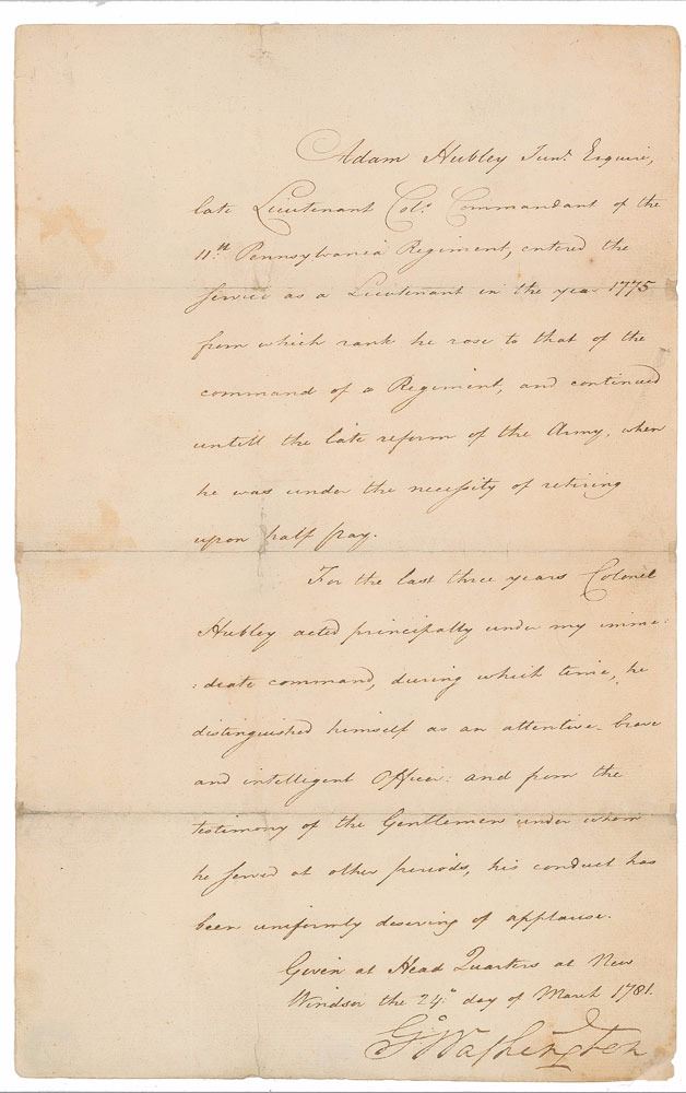 Revolutionary War-dated LS signed “G:o Washington,” one page, 7.75 x 12.5, March 24, 1781. A letter of commendation, in full: "Adam Hubley Junr. Esquire, late Lieutenant Col. Commandant of the 11th Pennsylvania Regiment, entered the service as a Lieutenant in the year 1175 from which rank he rose to that of the command of a Regiment, and continued untill the late reform of the Army, when he was under the necessity of retiring upon half pay. For the last three years Colonel Hubley acted principally under my immediate command, during which time, he distinguished himself as an attentive, brave and intelligent Officer: and from the testimony of the Gentlemen under whom he served at other periods, his conduct has been uniformly deserving of applause. Given at Head Quarters at New Windsor the 24th day of March 1781." In very good to fine condition, with areas of light staining, repaired lower right corner tip, and archival reinforcements to folds on the reverse.