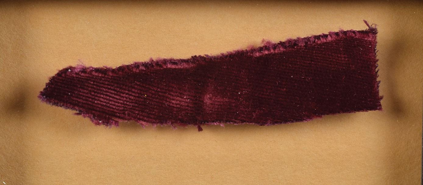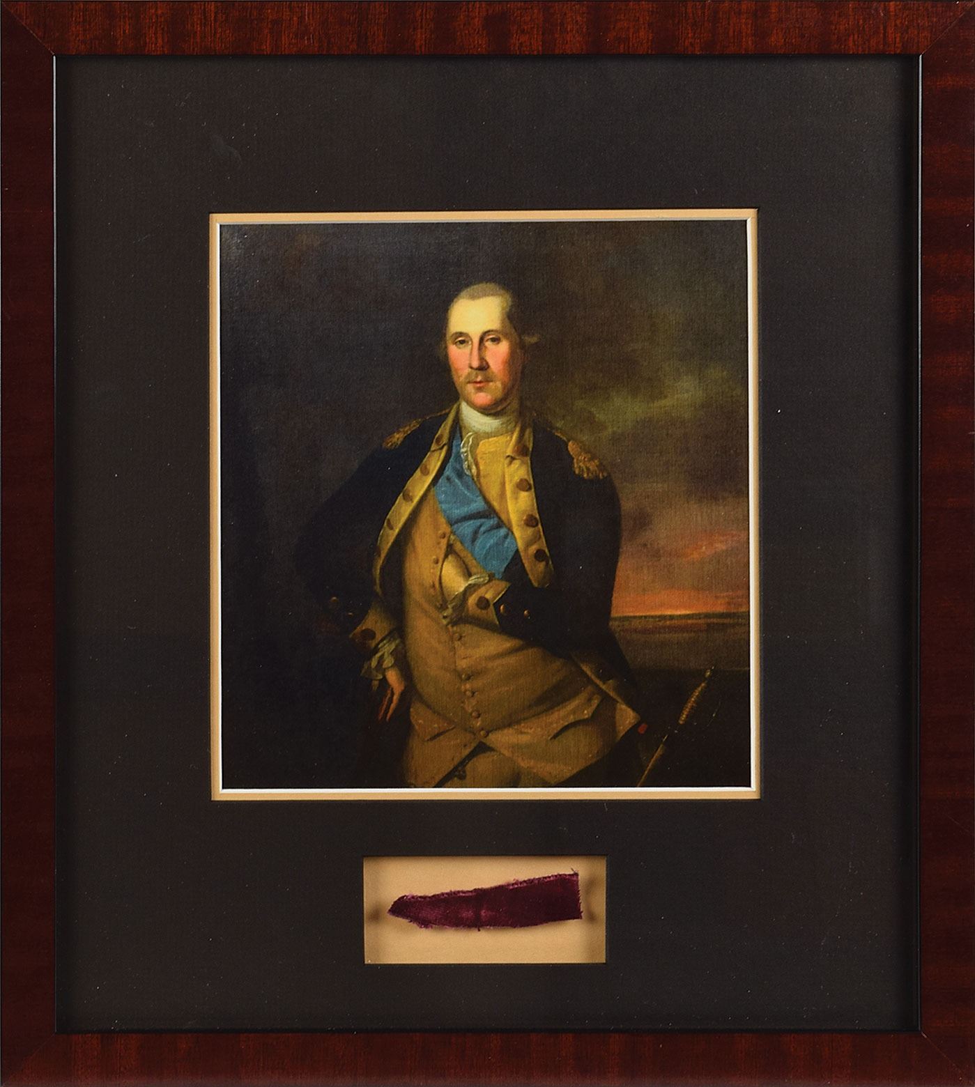 Remarkable swatch of burgundy velvet, 2.75 x .75, removed from the cloak of George Washington. Mounted and framed with a color print of the president to an overall size of 13.25 x 14.75. In fine condition. Accompanied by a copy of an identification sheet, penned in the late 18th or early 19th century: "A Piece of Mr. Washington's Cloak." Consignor notes that the velvet swatch originates from the family of Tobias Lear, one of Washington's most trusted friends and his personal secretary from 1784 until Washington's death in 1799.