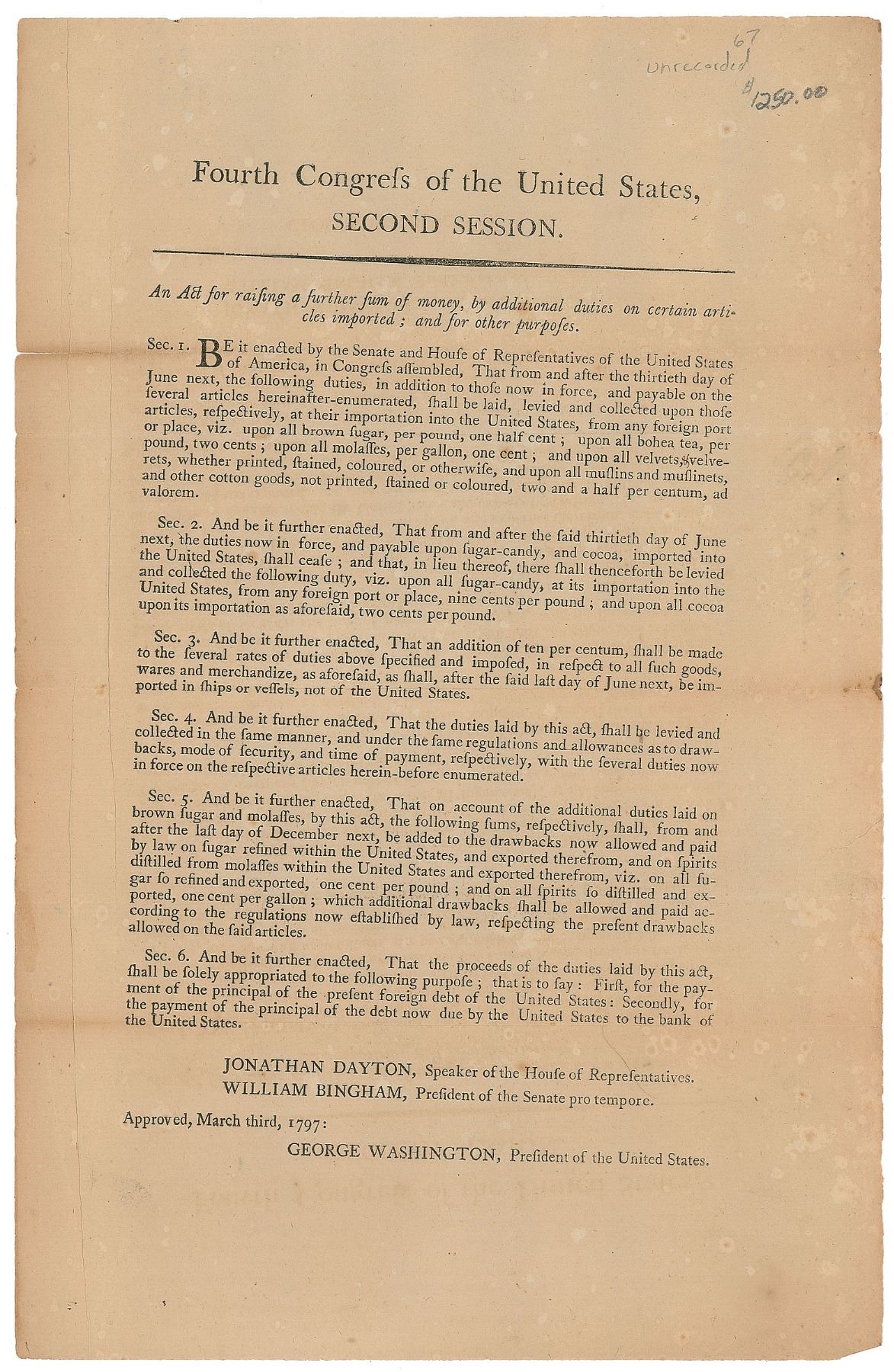Unsigned printed Congressional act approved by President Washington, one page, 7.5 x 11.75, March 3, 1797, entitled: "An Act for raising a further sum of money, by additional duties on certain articles imported; and for other purposes." In part: "Be it enacted…That from and after the thirtieth day of June next, the following duties, in addition to those now in force, and payable on the several articles hereinafter enumerated, shall be laid, levied and collected upon those articles, respectively, at their importation into the United States, from any foreign port or place." The articles named include brown sugar, tea, molasses, textiles, cocoa, and sugar-candy. Printed at the conclusion with President George Washington's approval. In very good condition, with splitting to one of the horizontal folds, and light overall mottled toning.