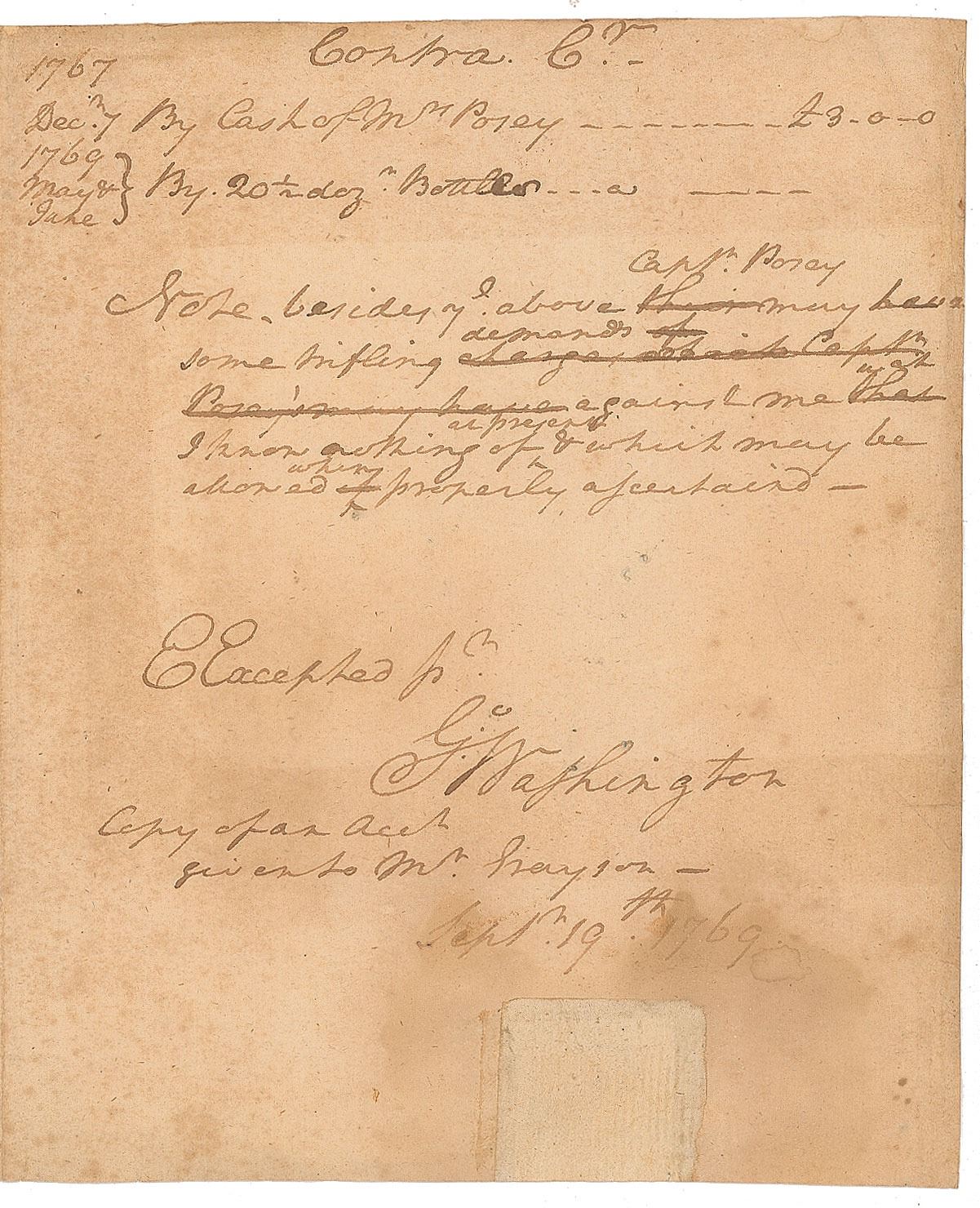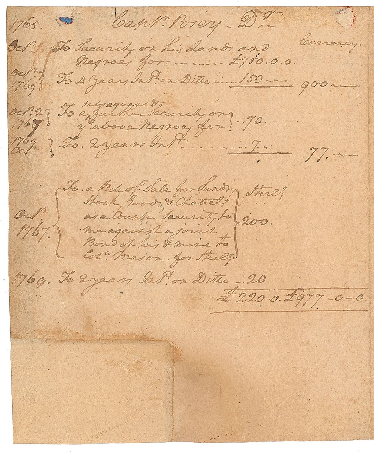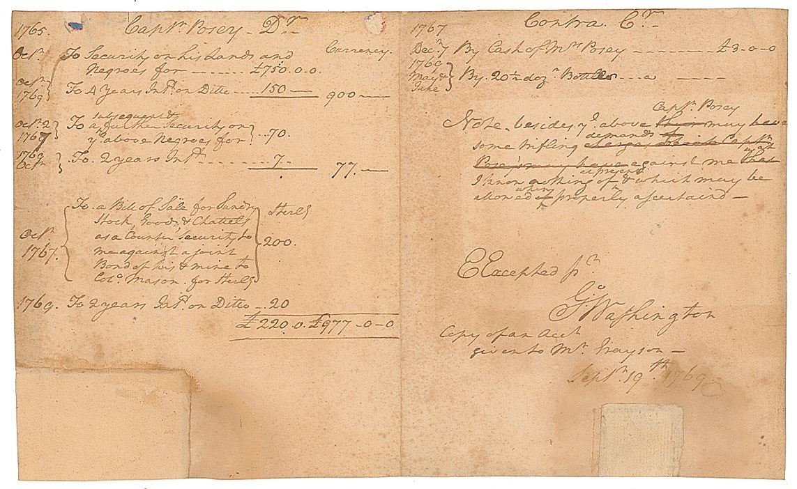 ADS, signed “Go: Washington,” two pages on two adjoining sheets, 6 x 7.5, September 19, 1769. A financial ledger document headed "Capt'n Posey," transactions made between 1765 and 1769, including "Security on his Lands and Negroes for £750," "A subsequent & further security on ye above Negroes for £70," and "a Bill of Sale for Sundry stock, goods & chattels as a…security to me against a joint bond of his & mine to Colo. Mason for £200." On the right side, a £3 cash payment is recorded, below which Washington writes: "Note, besides ye above Capt'n Posey may have some trifling demands against me that I know nothing of at present & which may be showed when properly ascertained." Washington signs at the conclusion with errors excepted, "E. Excepted pr Go: Washington, Copy of an Acc't given to Mr. Grayson, Sept'r 19th 1769." In very good condition, with toning, light foxing and staining, and old repairs to two areas of paper loss (which affect none of the handwriting).