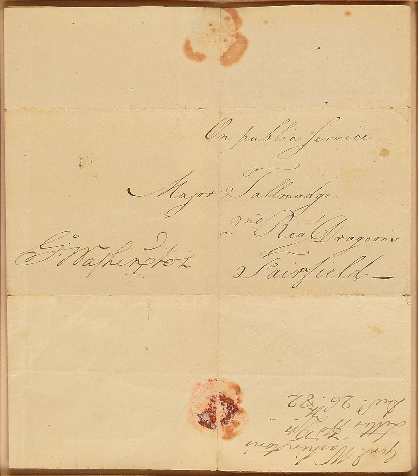 Washington was Commander-in-Chief of the Armies of the United States at the time this envelope was signed, but the War for Independence was quickly coming to a close; Charles Cornwallis surrendered at Yorktown on October 19, 1781, and the French army and navy had already departed by this time. Benjamin Tallmadge was Washington's chief intelligence officer during the Revolutionary War and the organizer of the Culper Ring, which conducted covert operations in order to gain information regarding British activities in New York. It was through the work of the Culper Ring that evidence of Benedict Arnold's treason first came to light.