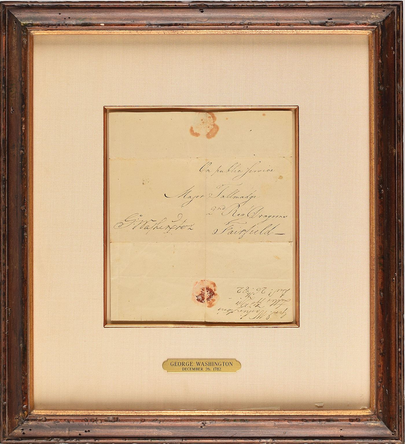 Desirable full free frank, unfolded to 7 x 8, addressed in another hand to "Major Tallmadge, 2nd Regt Dragoons, Fairfield," and franked in the lower left of the panel, "Go: Washington." The lower flap bears wax seal remnants and annotation, "Gen'l Washington, Letter HdQrs, Dec'r 26th, 82." Archivally cloth-matted and framed to an overall size of 15.25 x 16.75. In fine condition.