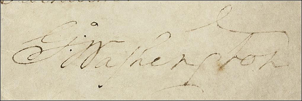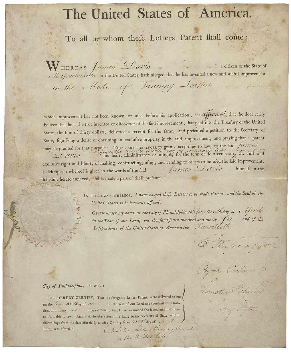 Partly-printed vellum DS as president, signed “Go: Washington,” one page, 12.5 x 15.25, April 14, 1796. Washington grants a patent to James Davis for “a new and useful improvement in the mode of tanning leather.” Signed at the bottom by Washington, and countersigned by Secretary of State Timothy Pickering and Attorney General Charles Lee. Accompanied by a 12.5 x 15.25 manuscript document from Davis, describing the improvement. In very good condition, with intersecting folds, one through tops of a few letters of signature, scattered light toning and foxing, some wrinkling, and much of Washington’s signature a bit light, but completely legible. The white paper seal is creased and toned, but intact, and the original small blue ribbon is still attached.