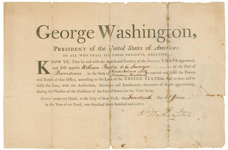 Partly-printed DS, signed “Go: Washington,” one page, 12.75 x 8.25, June 14, 1790. Washington appoints “William Barton to be Surveyor of the Port of Providence in the State of Rhode Island and Providence Plantations to exercise and fulfill the Powers and Duties of that Office, according to the Laws of the United States.” In good to very good condition, with toning along heavy vertical folds, one fold through a single letter of signature (old reinforcement on reverse to two of the folds and to the lower left corner), scattered creases, foxing, toning and soiling, a few edge chips, and a repaired tear to lower right.