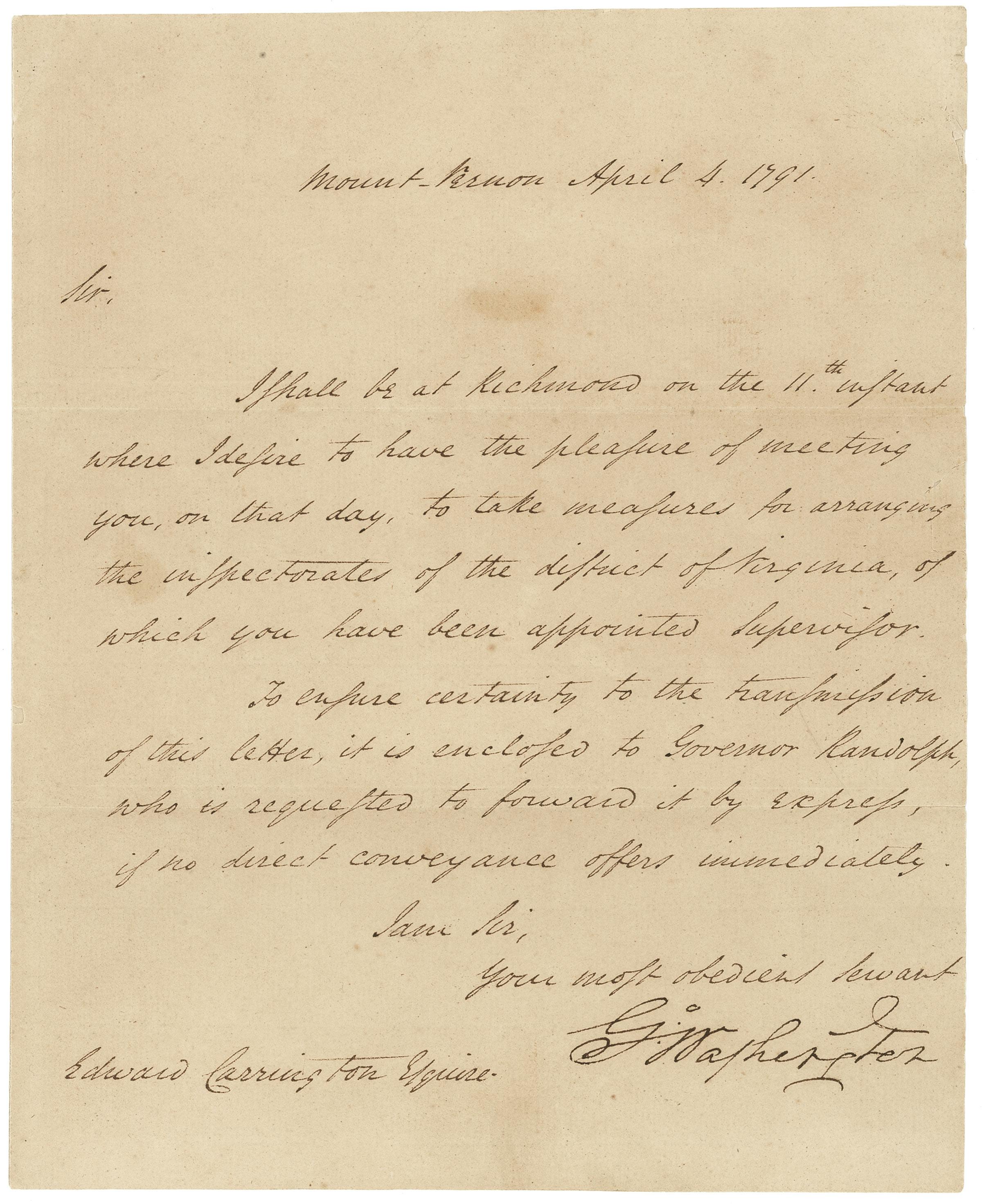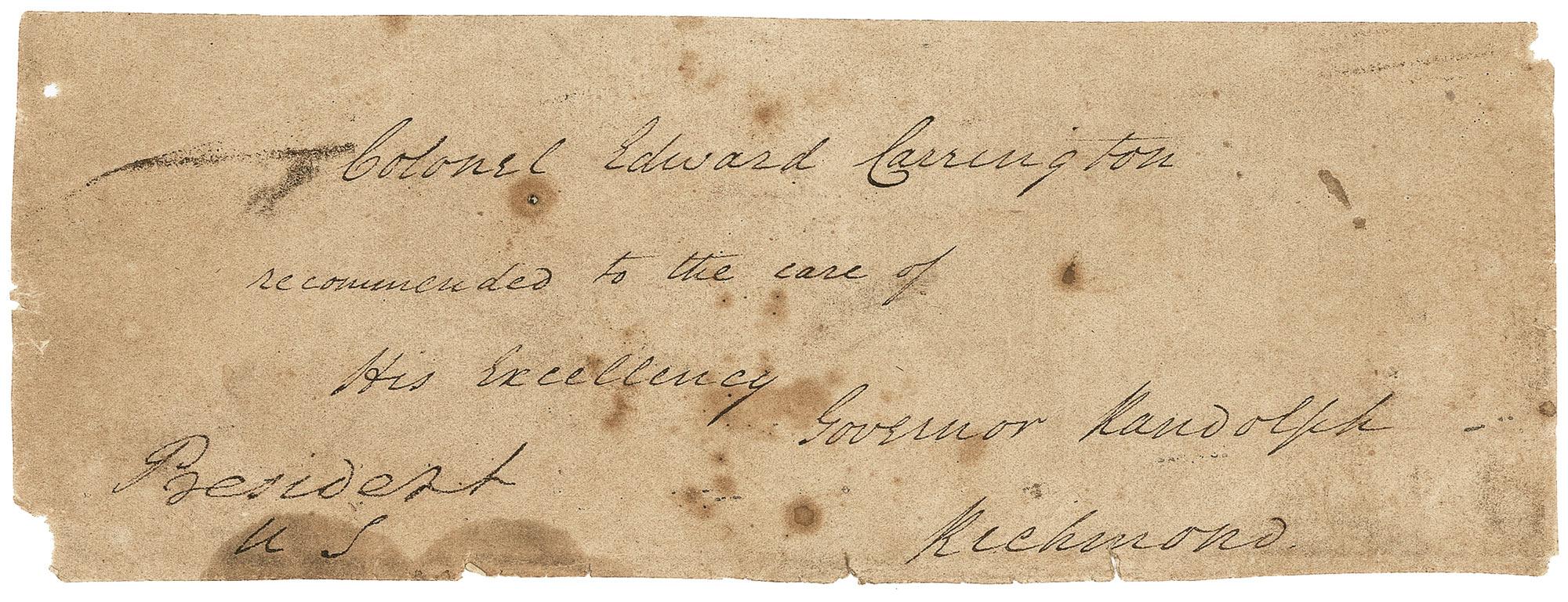 Franking signature as President, “President, U.S.,” on a 6.5 x 3 postal cover addressed in another hand to Miss Catharine Goddard in Baltimore, postmarked New York, January 7 [circa 1790]. Goddard (1738–1816), a printer, publisher, and postal employee, earned a footnote in American history in January 1777 as the printer of the first copy of the Declaration of Independence to include the names of all the signers. In 1775, she had become Postmaster of Baltimore, the first woman to hold such a position in the American colonies. In 1789, despite having held the post for 14 years, Goddard was ousted following the objections of more than 200 businessmen who signed a petition and directly appealled to Washington. The removal was a stark demonstration of the prevailing attitude toward the abilities of women at the time. The lower flap bears a black wax seal with a heraldic device. In very good condition, with seal-related losses and tears to blank flaps (a few tiny tears just extending into margins of address panel), mild soiling, and handling wear. The signature is dark, distinct, and unaffected. Pre-certified John Reznikoff/PSA/DNA and RRAuction COA.