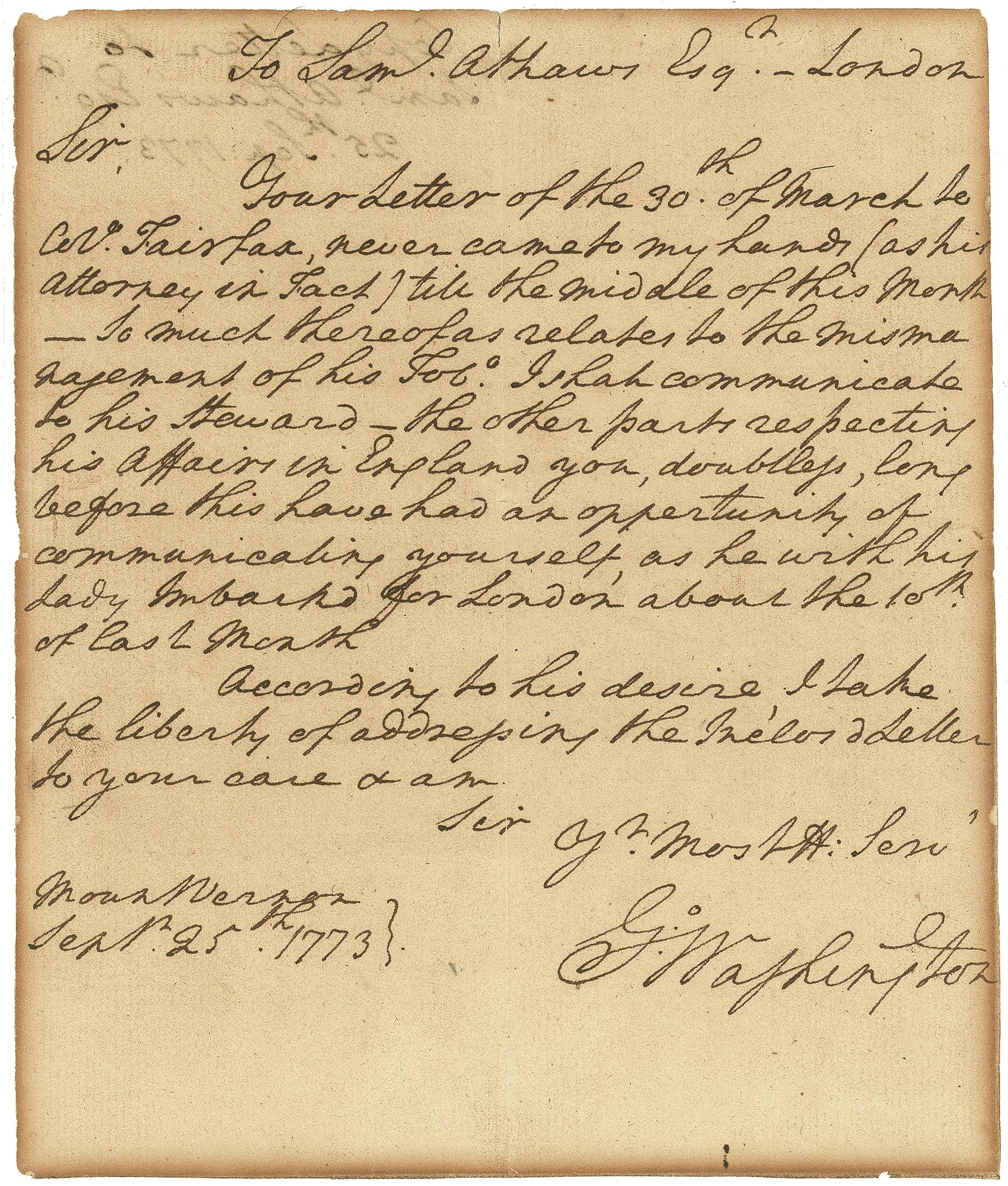 Boldly penned ALS signed “Go: Washington,” one page, 6.25 x 7.5, September 25, 1773. Letter to to Samuel Athaws of London. In full: “Your letter of the 30th of March to Col. Fairfax, never came to my hands (as his Attorney in Fact) till the middle of this month – so much thereof as relates to the mismanagement of his tob[acc]o. I shall communicate to his steward – the other parts respecting his affairs in England you, doubtless, long before this have had an opportunity of communicating yourself, as he with his Lady embarked for London about the 10th of last month.