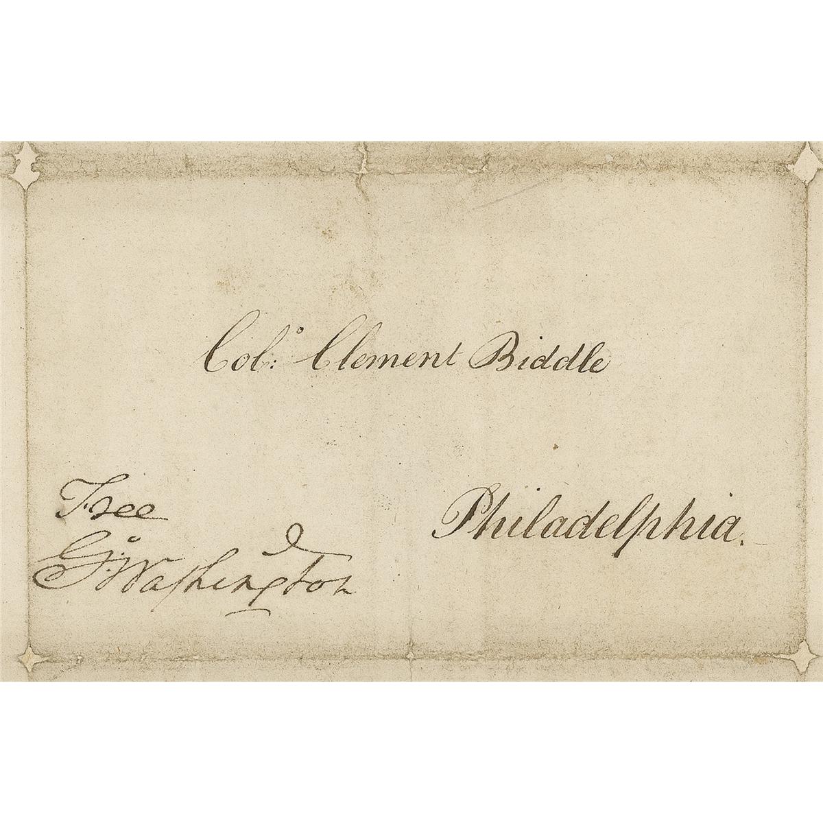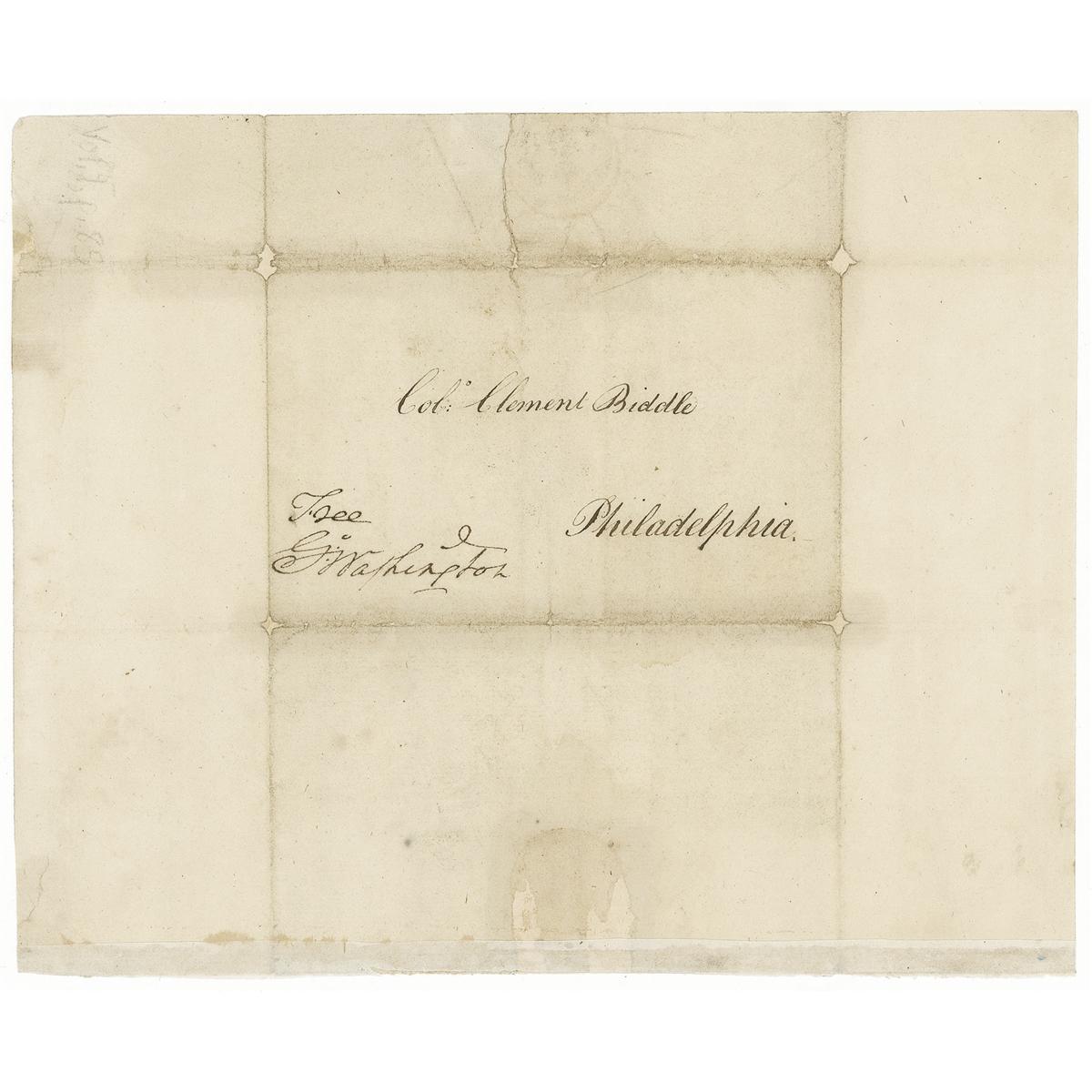 Full free frank, measuring 9.25 x 7.5 unfolded, with franked panel measuring 5 x 3.25, addressed in another hand to “Col. Clement Biddle, Philadelphia,” and franked in the lower left “Free Go: Washington.” In very good to fine condition, with several professional repairs along folded edges of address panel and paper loss from seal at top and bottom edge, some scattered light toning and soiling, and a light central vertical fold through address panel. Washington’s signature is bold and unaffected. Accompanied by a partly-printed DS, endorsed on the reverse, “Clement Biddle,” two pages both sides, 8.25 x 13, May 25, 1792, a legal document involving a financial dispute. Document is in very good condition, with a few chips, edge separations at folds, and scattered wrinkling, soiling, and handling wear.