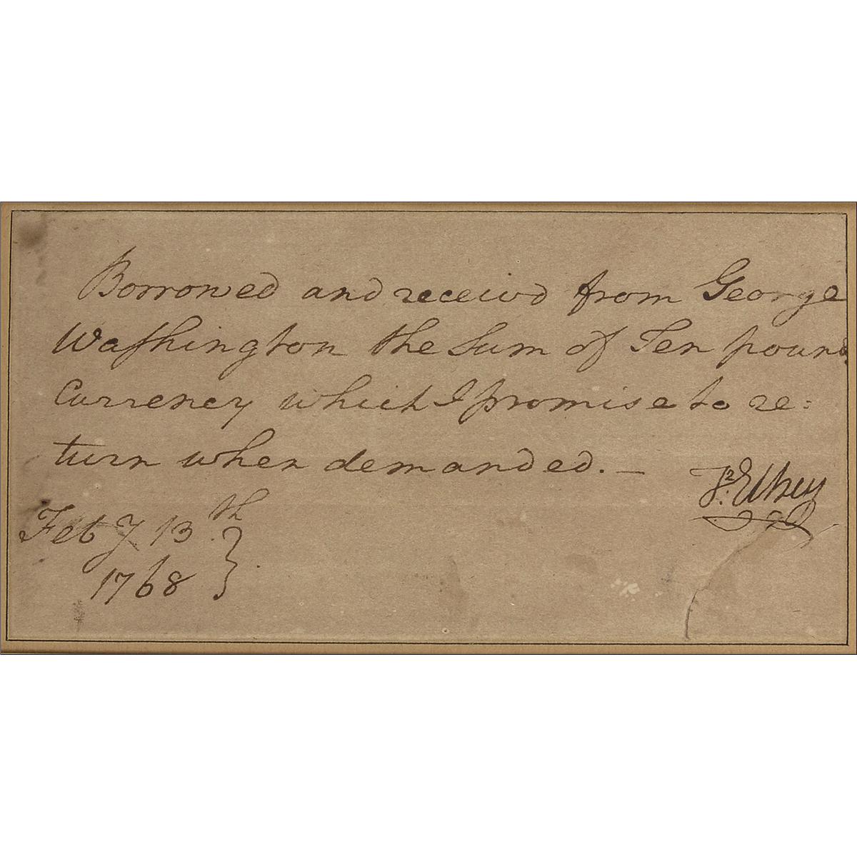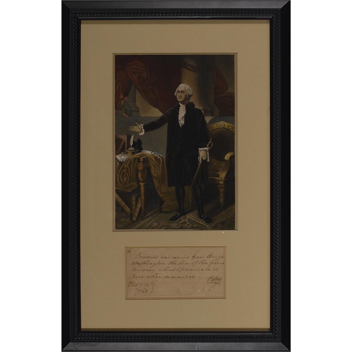 ADS, signed “George Washington” in the text, one page, 6.25 x 3.25, February 13, 1768. A promissory note, completed entirely in Washington’s hand, reads, in full: “Borrowed and received from George Washington the sum of Ten pounds currency which I promise to return when demanded.” Document is also endorsed by the loan’s recipient T[homasin] Ellzey. Nicely matted and framed with a 19th century hand-colored portrait engraving of Washington to an overall size of 14.75 x 22.75. Inlaid into a slightly larger sheet and in very good to fine condition, with small tear to bottom right corner lightly affecting Ellzey’s signature, a couple light horizontal folds, a uniform shade of toning, with a few small spots of heavier toning.