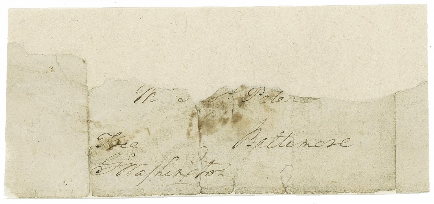 Free-franked partial address panel, 7.25 x 2, addressed by Washington to a Mr. Peters in Baltimore and franked in the lower left, “Free, Go: Washington.” In good to very good condition, with edge chips, a vertical fold passing through the last name, and areas of staining with the word “Free” partially affected. Professional affixed to a 7.25 x 3.25 sheet.