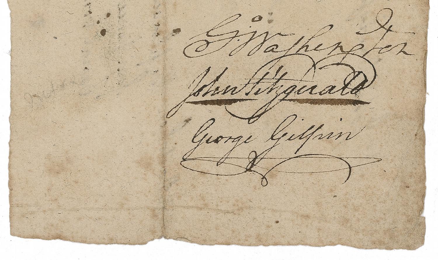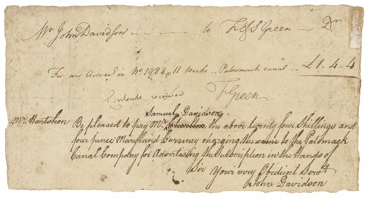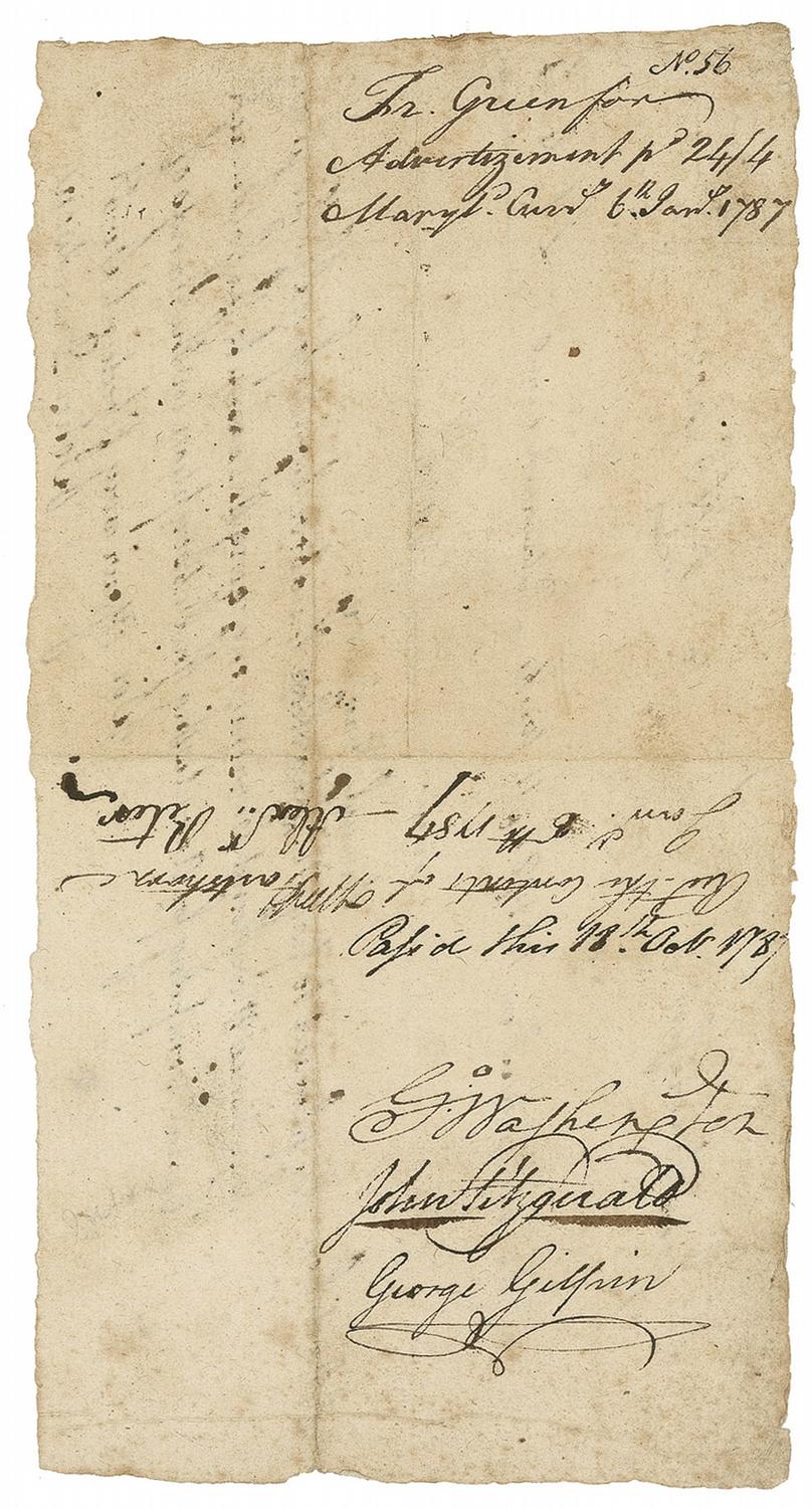 Endorsement signature, “Go: Washington,” on the reverse of a manuscript document, dated October 18, 1787. The document is a receipt for an advertising in the Potomack [sic] Canal Company and reads, in part: “Be pleased to pay Samuel Davidson the above twenty four shillings and four pence Maryland Currency charging the same to the Patomack Canal Company for advertising the Subscription.” Signed on the reverse by Washington, as well as John Fitzgerald and George Giffin. In very good condition, with intersecting folds, scattered toning and soiling, expected rough edges, small mounting remnant to top right corner, and some light show-through.