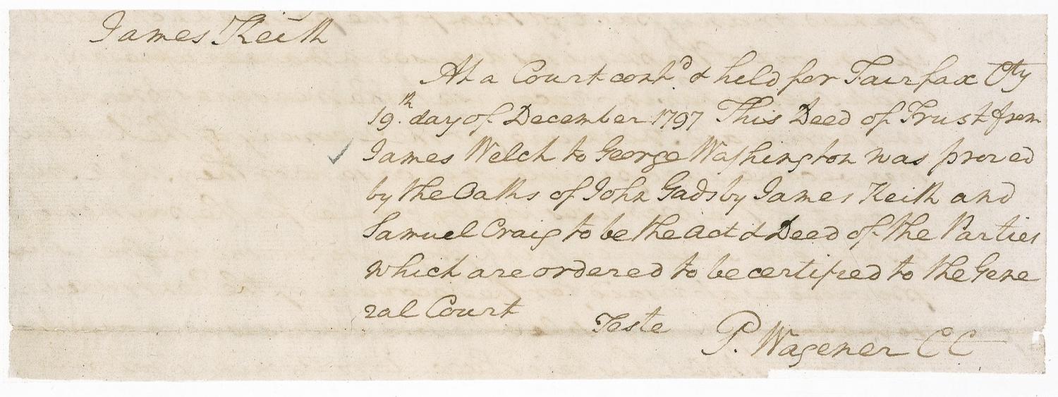 Partial self-contained ADS, signed in the text, “George Washington,” one page, 9 x 3.25, no date. Document reads, in full: “James Keith. At a Court contd & held for Fairfax Cty 19th day of December 1797 This Deed of Trust from James Welch to George Washington was proved by the Oaths of John Gadsby James Keith and Samuel Craig to be the act & Deed of the Parties which are ordered to be certified to the General Court. Teste P. Wagener CC.” Document has been cleanly and professionally silked. In fine condition, with silking as noted, and some minor mirroring of ink from missing text.