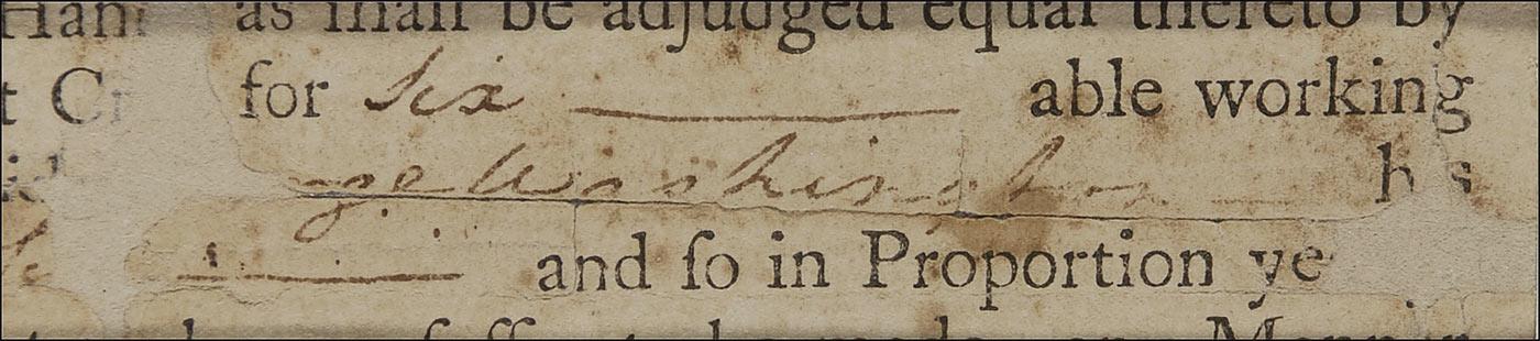 Partial ink signature, “[Geor]ge Washington” on an off-white 3.25 x .75 slip clipped from a larger document from March 1769. Double matted and framed, with a Washington portrait, to an overall size of 14.5 x 17.5. In good condition, with tape repair to a horizontal separation through portion of signature (concealed by the matting), first four letters of signature missing due to surface loss, and light soiling and toning. Accompanied by a photocopy of the document from which this signature was removed.