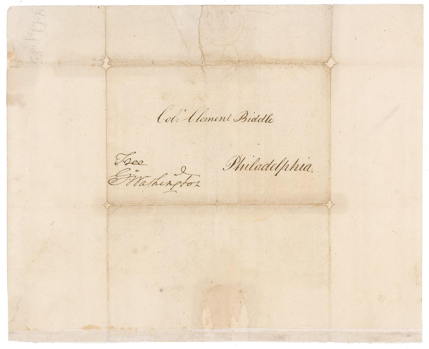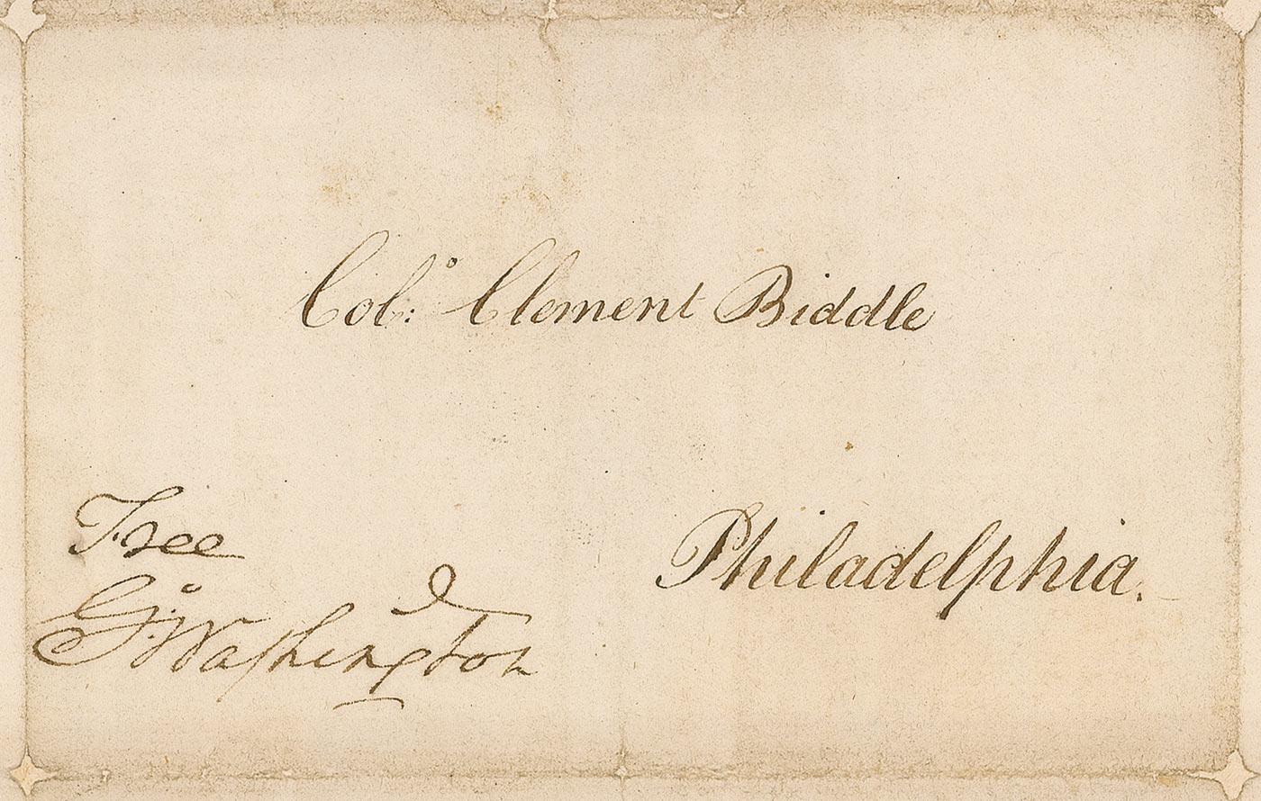 Full free frank, measuring 9.25 x 7.5 unfolded, with franked panel measuring 5 x 3.25, addressed in another hand to “Col. Clement Biddle, Philadelphia,” and franked in the lower left “Free Go: Washington.” In very good to fine condition, with several professional repairs along folded edges of address panel and paper loss from seal at top and bottom edge, some scattered light toning and soiling, and a light central vertical fold through address panel. Washington’s signature is bold and unaffected. Biddle served as deputy quartermaster general of the Pennsylvania and New Jersey militia as well as the Commissary General at Valley Forge under Washington. The hardships faced by Washington and his men are, of course, legendary. Lost to history, however, are those men like Biddle—who as the officer in charge of providing supplies such as boots and clothing failed in his responsibilities. The inefficiency of the commissary departments meant that nearly 3,000 soldiers in camp in Valley Forge were unfit for duty because they were barefoot and destitute of clothing. Free franks from the Father of Our Country are always rare and desirable and with a significant Revolutionary War association offers an exceptional example from this most important of American statesmen!