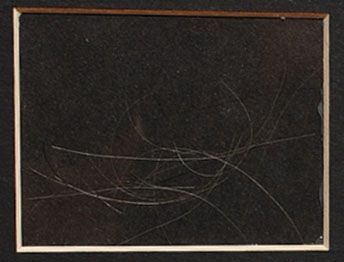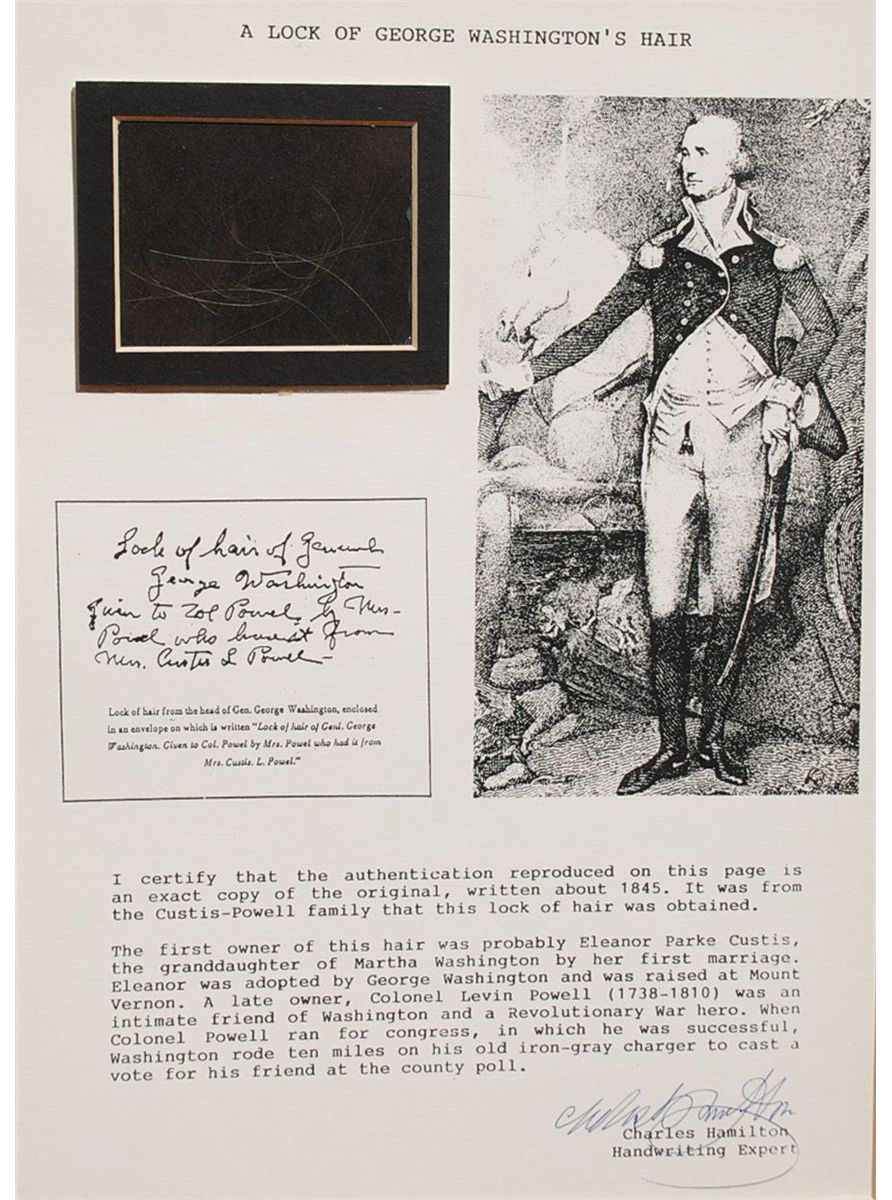 Hair Strands from George Washington, A lock of Washington’s hair, encapsulated in plastic and affixed to a photocopied authentication by Charles Hamilton stating that the hair was probably first owned by Martha Washington’s granddaughter. In fine condition