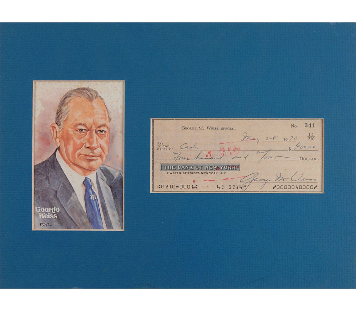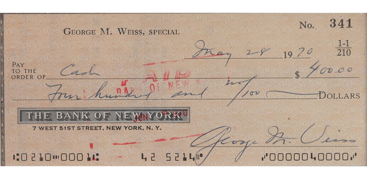 Personal check, 5.75 x 2.5, filled out and signed by Weiss, “George M. Weiss,” payable to Cash for $400, May 28, 1970. Matted with a Perez-Steele card of Weiss to an overall size of 12 x 9. In fine condition, with expected bank stamps.