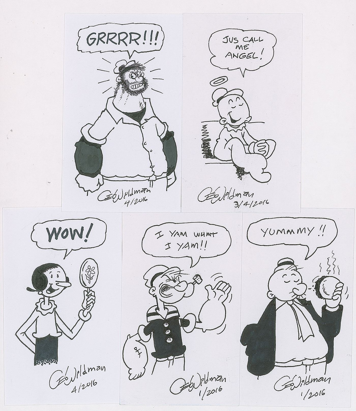 Fantastic set of five original sketches by George Wildman of the five main characters of the Popeye comic strip, each accomplished in ink on white 3 x 5 cards, with Wildman signing and dating below each sketch, and adding a speech bubble to each character, including: Popeye (‘I yam what I yam!!’), Olive Oyl (‘Wow!’), Bluto (‘Grrrr!!!’), Swee'Pea (‘Jus call me angel!’), and Wimpy (‘Yummy!!’). In overall very fine condition.