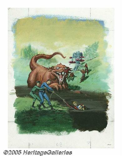 <B>George Wilson (attributed) - Space Family Robinson Lost in Space #45 Cover Original Art (Gold Key, 1975).</B></I> "The Robinsons rescue a space boy trapped on the planet of the monsters!" The image area of this acrylic on board painting is 13" x 15.5", and the art is in Excellent condition. <I>From the Random House Archives</B></I>.
