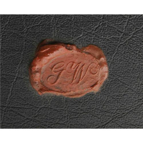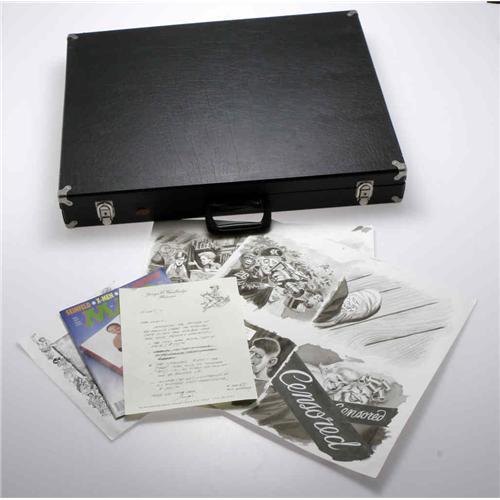 <B>George Woodbridge Attache Case Portfolio with Mad #327 Original Art Contents (EC, 1994).</B></I> The late George Woodbridge spent nearly fifty years making us all laugh through his exquisitely detailed, and incredibly funny pen and ink drawings published by <B>Mad</B></I>. A stickler for details, Woodbridge was also well-known as an illustrator for military history books, cranking out faithfully researched, highly detailed art for such books as his three-volume set, <B>American Military Equipage, 1851-1872</B></I>. Here's his original portfolio, a handsome black leather-finish attache case, measuring approximately 21" x 27" x 4". A hard wax stamp appears on the top edge, featuring his initials, and a small plaque inscribed "G. Woodbridge" is mounted by the handle. Inside, there's a note from Woodbridge on his stationery, a photocopy of an illustration, and two pages of Woodbridge original art from Mike Snider's <B>Mad</B></I> #327 story "Thanks to Home Video Cameras We Now Have on Tape --," done in grey wash on 17.5" x 17.5" bristol. A copy of the issue is included. The case is in Very Good condition, with only modest wear, and the art is in Excellent condition. This is a wonderful memento from a <B>Mad</B></I> fan favorite. <I>From the Estate of Robert Woodbridge</B></I>.
