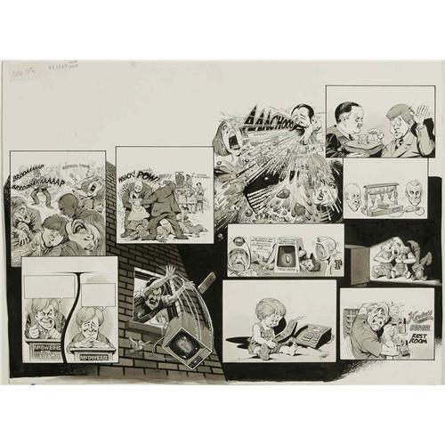 <B>George Woodbridge - Mad #345 Complete 2-page Story "Why Is It?" Original Art (EC, 1996).</B></I> George Woodbridge's keen observational humor adds a real punch to these scene spotlighting the mysteries of modern life. For example, "Why is it that the only time postal employees move fast is when they're shooting up a post office?" Or, "Why is it rap stars aren't so concerned about police brutality when it's inflicted by the Judge Dredd wannabes they hire as personal security guards?" This outrageous ink and greytone piece (which depicts both story pages on one sheet of paper) has an image area of 25.5" x 19", and the art is in Excellent condition. A copy of <B>Mad</B></I> #345 is included, so you can read the other "Why Is It?" questions. <I>From the Estate of George Woodbridge</B></I>.