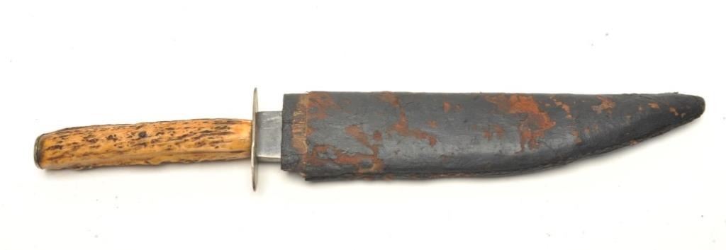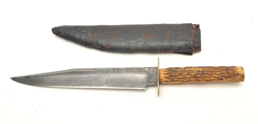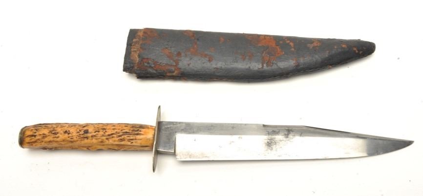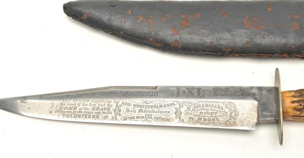 George Wostenholm & Sons clip point Bowie knife measuring 13 ½” overall with a 8 ¾” blade and stag grips with desirable “I.X.L. Hunter’s Companion” mark along with Washington works and patriotic Americanslogans. The blade is good and good overall with associated sheath. Ex George Taylopr collection. Est.: $2500-$5000