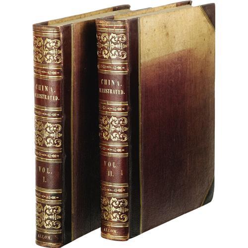 <B>George Newenham Wright: <I>China, In a Series of Views, Displaying the Scenery, Architecture, and Social Habits, of That Ancient Empire.</B></I></B></I> (London: Fisher, Son, & Company, 1843), first edition, four volumes bound into two, 96, 72, 68, and 72 pages respectively, 4 engraved title-pages, 124 finely engraved steel-plates illustrated by Thomas Allom, bound by David Condie, Worcester in half calf, four raised bands with gilt titles and decoration, gilt edges, 4to (8.75" x 11"), former owner's bookplate on inside front cover of each volume, foxing to endpapers and title pages, minor foxing throughout, minor rubbing to leather on spines, bumped corners, sun fading to the back board of volume one and sun fading to front board of volume two, else both volumes very good. Included in the second bound volume is a 72-page history of the "Life of Kang-He, Emperor of China". This set is well known to collectors for its wonderful steel engravings, representative of some of the best 19th century illustrations.<BR><BR><b>Shipping:</b> Books & Catalogs (<a target="_blank" href="http://www.heritageauctions.com/common/shipping.php">view shipping information</a>)