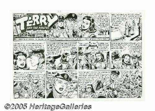 <B>George Wunder - Terry and the Pirates Sunday Comic Strip Original Art, dated 12-22-63 (Chicago Tribune, 1963).</B></I> When Milton Caniff left <I>Terry and the Pirates</B></I> in 1946, George Wunder took over, and continued as the strip's primary artist until it ceased publication in 1973. Wunder had a precise, illustrative style and neatly captured the characters created by his predecessor. There's a lot going in in this jam-packed Sunday, including Conrad Constable's return from space, and wife Peg's jealousy, all rendered in Wunder's razor-sharp inking style. The image area of the art measures 25.5" x 17" and the piece was assembled from nine separate panels all glued to a common backing board, and is in Very Good condition overall.