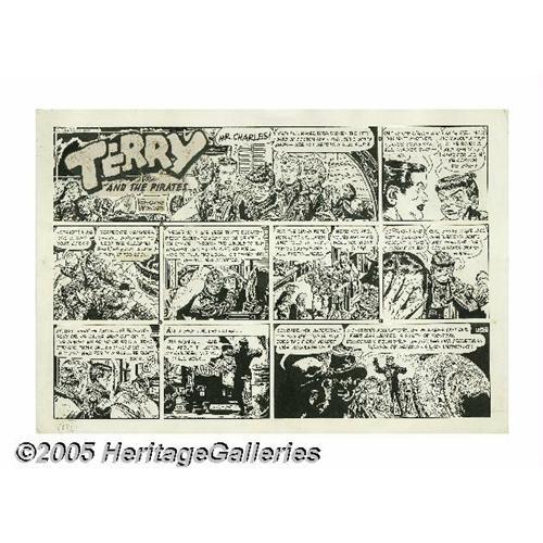 <B>George Wunder - Terry and the Pirates Sunday Comic Strip Original Art, dated 12-31-50 (Chicago Tribune, 1950).</B></I> George Wunder had the unenviable task of succeeding Milton Caniff on <I>Terry and the Pirates</B></I>, but he passed muster with flying colors and went on to have a 27-year run on the feature. George Wunder displays his hallmarked, boldly detailed brushwork. Terry and Hot Shot Charlie star in this episode. The image area of the strip measures 25.5"" x 17"". The logo stat has some glue staining and each panel of the Sunday has been carefully glued to the support paper; otherwise the art is in Very Good condition. <BR><BR><B>Important notice:</B> Heritage usually auctions material at the rate of 200-250 lots per hour. On some occasions eBay Live bid software or the Internet may not be able to keep up with the pace of the auction. We recommend placing a realistic absentee bid now as insurance to avoid disappointment. Occasionally the auctioneer may eliminate or reject an eBay Live bid, and the auctioneer may also reopen a lot after the close of the eBay live bidding (usually because we missed an audience bid), and may reject your bid even if it shows you as the winning bidder. By bidding via eBay Live, you agree that Heritage may award the lot to another bidder at its sole discretion under the circumstances described above or any other reasonable circumstances. Since eBay bids are not shown to us until we open the lot on the floor, we treat those bids just like floor bids. In most cases the floor responds before the eBay bid is presented to us, due to Internet lag time, so for consistency we have made it a policy that floor bids are always considered first over tie eBay live bids. Also please note that all Heritage lots purchased through eBay Live carry a 20% Buyer's Premium. Please make sure you read the Terms and Conditions before you bid. This lot is being auctioned in conjunction with a live floor auction by Heritage Galleries & Auctioneers. All
