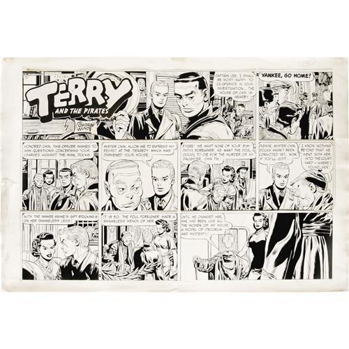 <B>George Wunder - Terry and the Pirates Sunday Comic Strip Original Art, dated 3-3-57 (News Syndicate, 1957).</B></I> International Cold War intrigue in China awaits you in this George Wunder Sunday. The image area measures approximately 25" x 17". Each panel of the strip has been glued to a support paper, and the art shows light aging, and glue staining; otherwise the condition is Good. <BR><BR><B>Important notice:</B> Heritage usually auctions material at the rate of 200-250 lots per hour. On some occasions eBay Live bid software or the Internet may not be able to keep up with the pace of the auction. We recommend placing a realistic absentee bid now as insurance to avoid disappointment. Occasionally the auctioneer may eliminate or reject an eBay Live bid, and the auctioneer may also reopen a lot after the close of the eBay live bidding (usually because we missed an audience bid), and may reject your bid even if it shows you as the winning bidder. By bidding via eBay Live, you agree that Heritage may award the lot to another bidder at its sole discretion under the circumstances described above or any other reasonable circumstances. Since eBay bids are not shown to us until we open the lot on the floor, we treat those bids just like floor bids. In most cases the floor responds before the eBay bid is presented to us, due to Internet lag time, so for consistency we have made it a policy that floor bids are always considered first over tie eBay live bids. Also please note that all Heritage lots purchased through eBay Live carry a 22.5% Buyer's Premium. Please make sure you read the Terms and Conditions before you bid. This lot is being auctioned in conjunction with a live floor auction by Heritage Auction Galleries. All final auction and invoice information will be supplied by Heritage Auction Galleries, and all other information should be considered preliminary. Lot:41001 <BR><BR><B>Winning Notification and Billing:</B> After the FINAL session in this auction is complete, Heritage will send e-mail and snail mail invoices. This process normally takes several days. All final auction and invoice information will be supplied by Heritage Auction Galleries, and all other information should be considered preliminary. <BR><BR>This auction will be conducted on a live auction floor and over the Internet through eBay Live. If you choose to place an absentee bid, please take a moment to <font color='#0000ff'><u><a href='http://pages.ebay.com/liveauctions/help/before/laabsentee.html'>learn how eBay Live absentee bidding works</a></u></font><font color='#000000'>