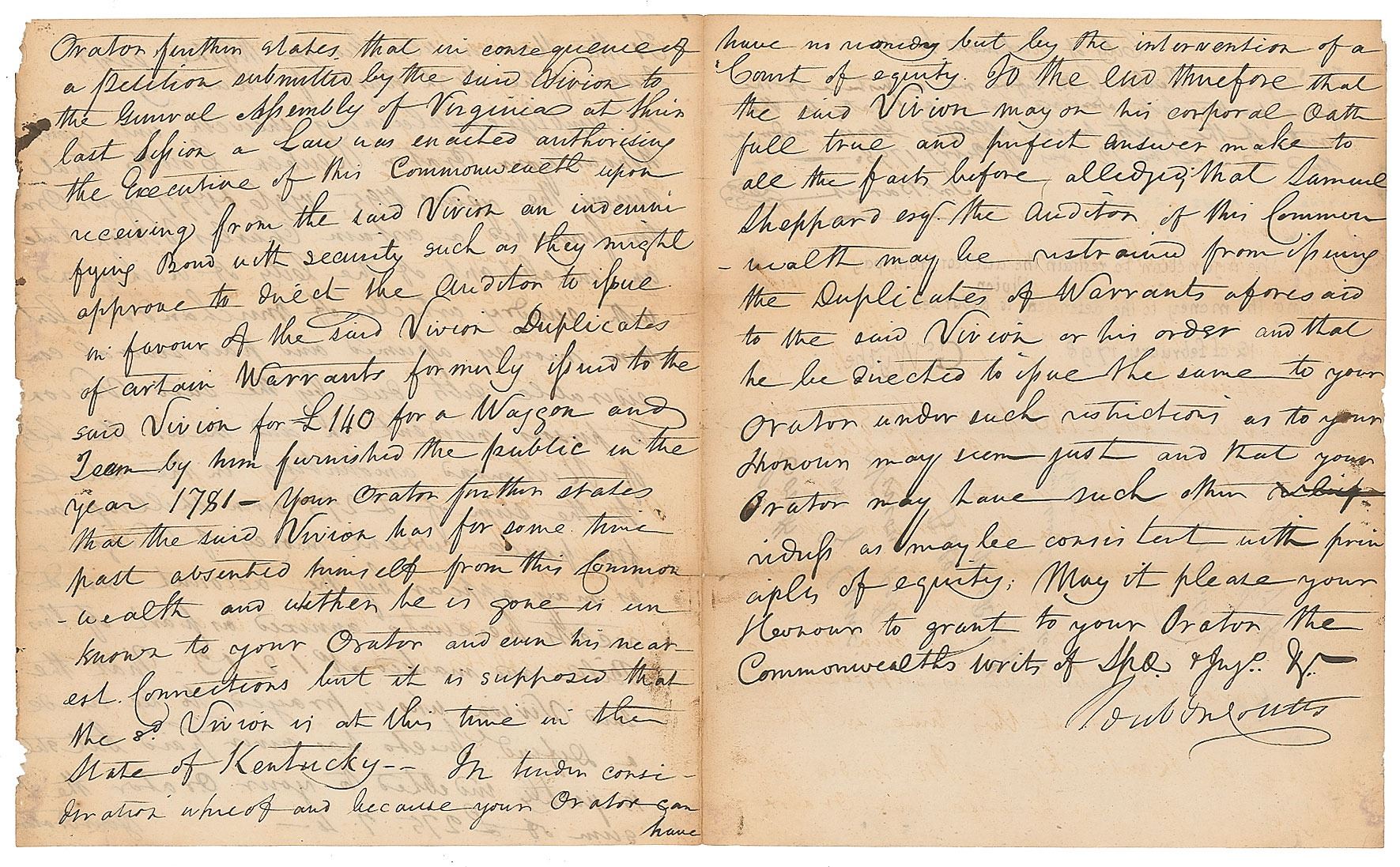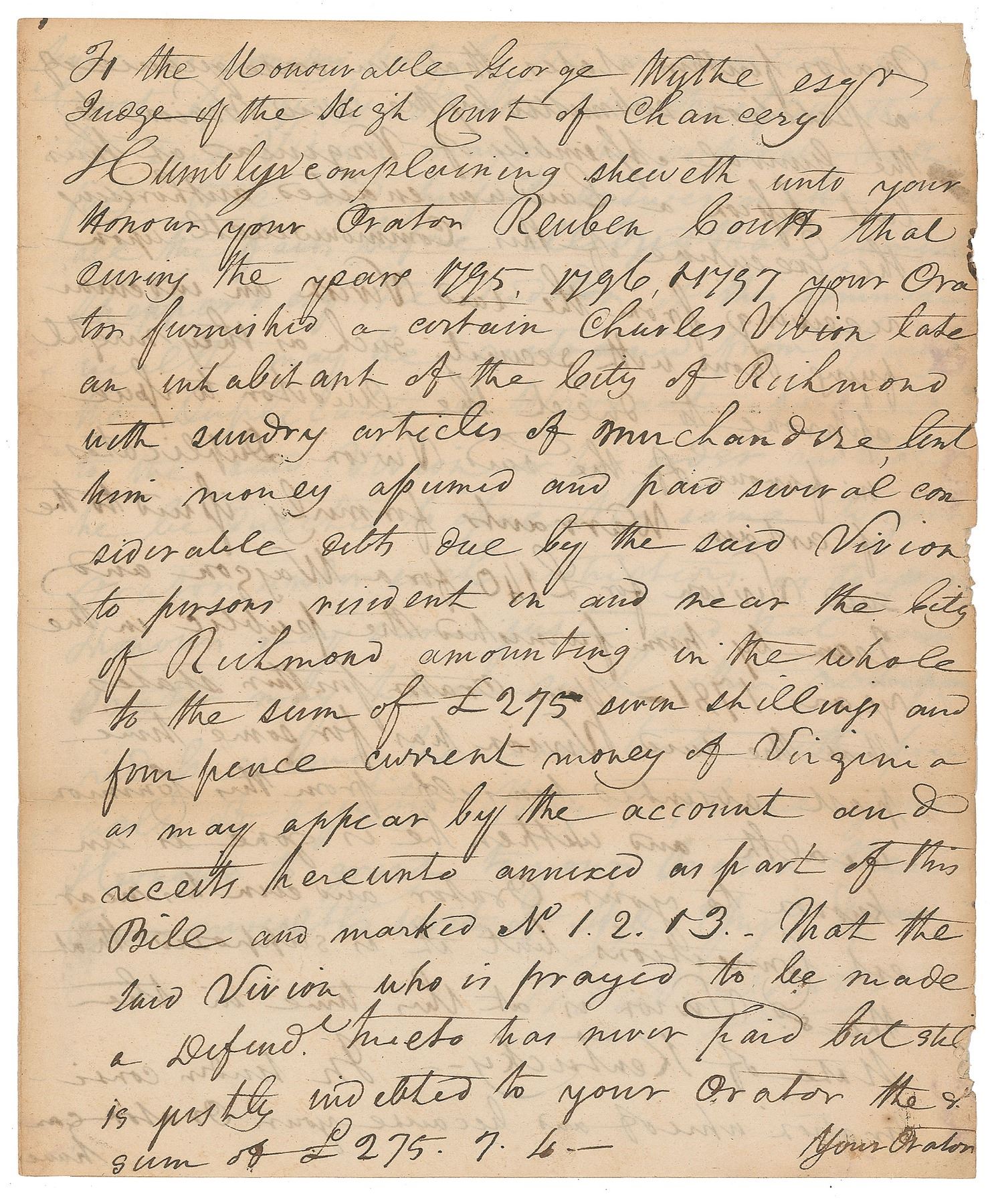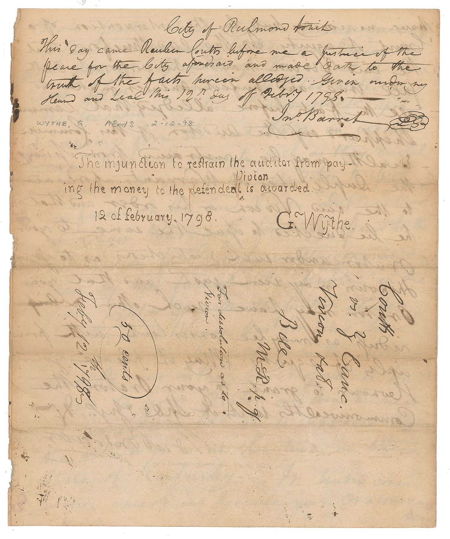 Rare autograph endorsement signed “G. Wythe,” penned at the conclusion of a letter addressed to "the Honourable George Wythe esqr., Judge of the High Court of Chancery," three pages on two adjoining sheets, 8 x 9.75, February 12, 1798. Wythe's endorsement: "The injunction to restrain the auditor from paying the money to the defendant Vivion is awarded." The letter, in part: "Your orator Rueben Coutts that during the years 1795, 1796, & 1797 your Orator furnished a certain Charles Vivion late an inhabitant of the City of Richmond with sundry articles of merchandise, lent him money assumed and paid several considerable debts due by the said Vivion to persons resident in and near the City of Richmond amounting the whole to the sum of £275 seven shillings and four pence current money of Virginia…that the said Vivion who is prayed to be made a Defend'r hereto has never paid." In fine condition, with multiple horizontal folds.