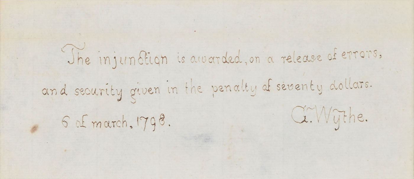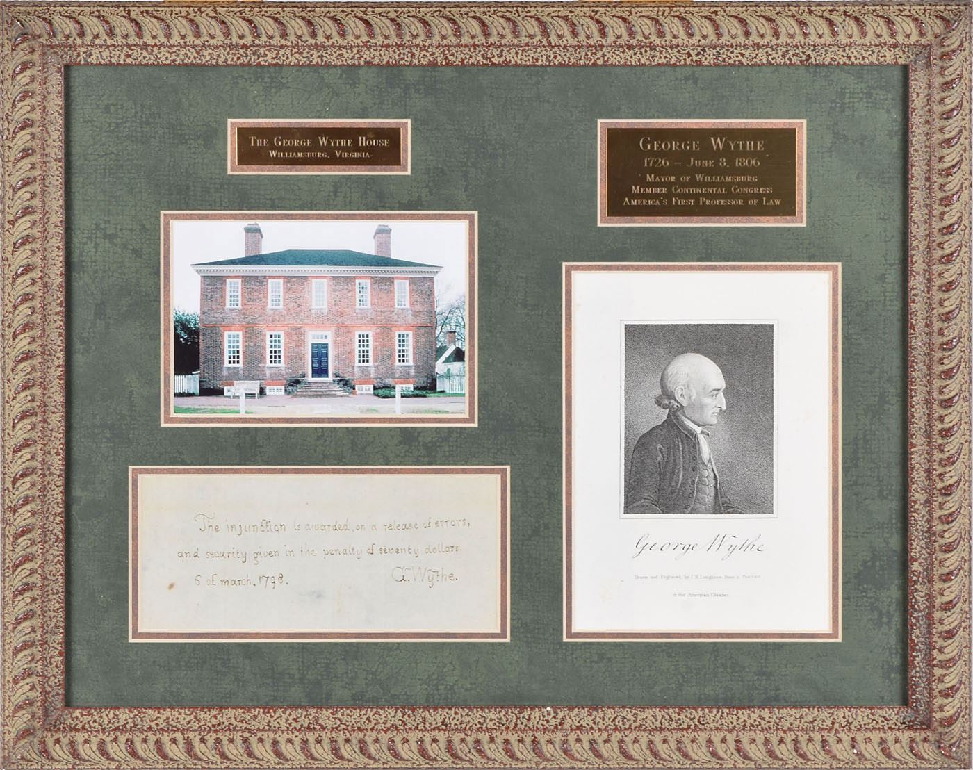 Scholar, jurist, opponent of slavery (1726-1806) who was the first of the seven Virginia signatories of the Declaration of Independence. ADS, signed “G. Wythe,” one page, 7 x 3, March 6, 1798. In full: "The injunction is awarded, on a release of errors, and security given in the penalty of seventy dollars." Impressively double-matted and framed with two plaques, an engraving, and an image of the George Wythe House in Williamsburg, Virginia, to an overall size of 19.25 x 15. In fine condition.