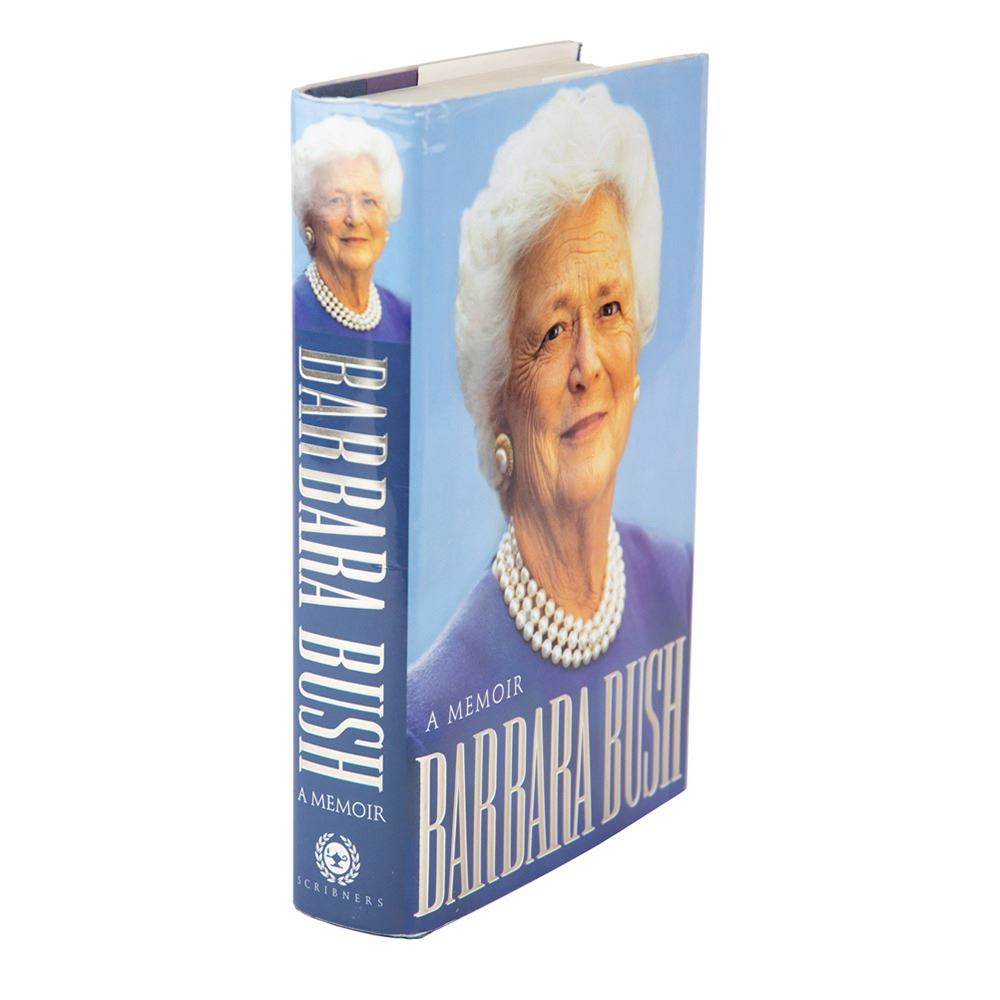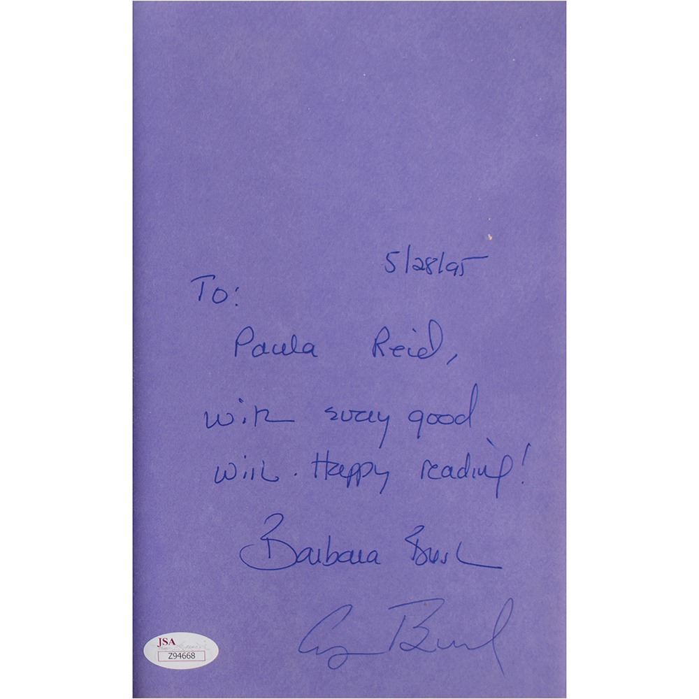 Signed book: Barbara Bush: A Memoir. First edition. NY: Charles Scribner's Sons, 1994. Hardcover with dust jacket, 6.5 x 9.5, 575 pages. Signed and inscribed on the first free end page in blue ink, "To: Paul Reid, with every good wish. Happy reading! Barbara Bush, 5/28/95," and in blue ballpoint, "George Bush." In fine condition, with a JSA label affixed to the signed page. Accompanied by a full letter of authenticity from JSA.